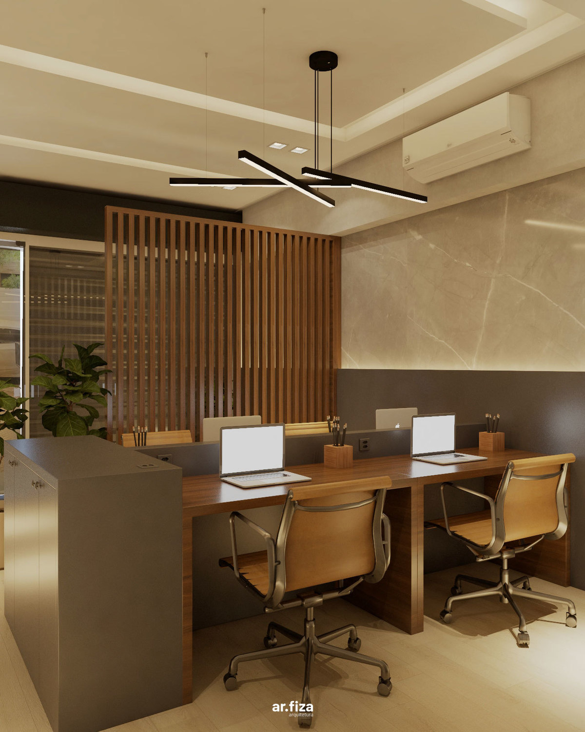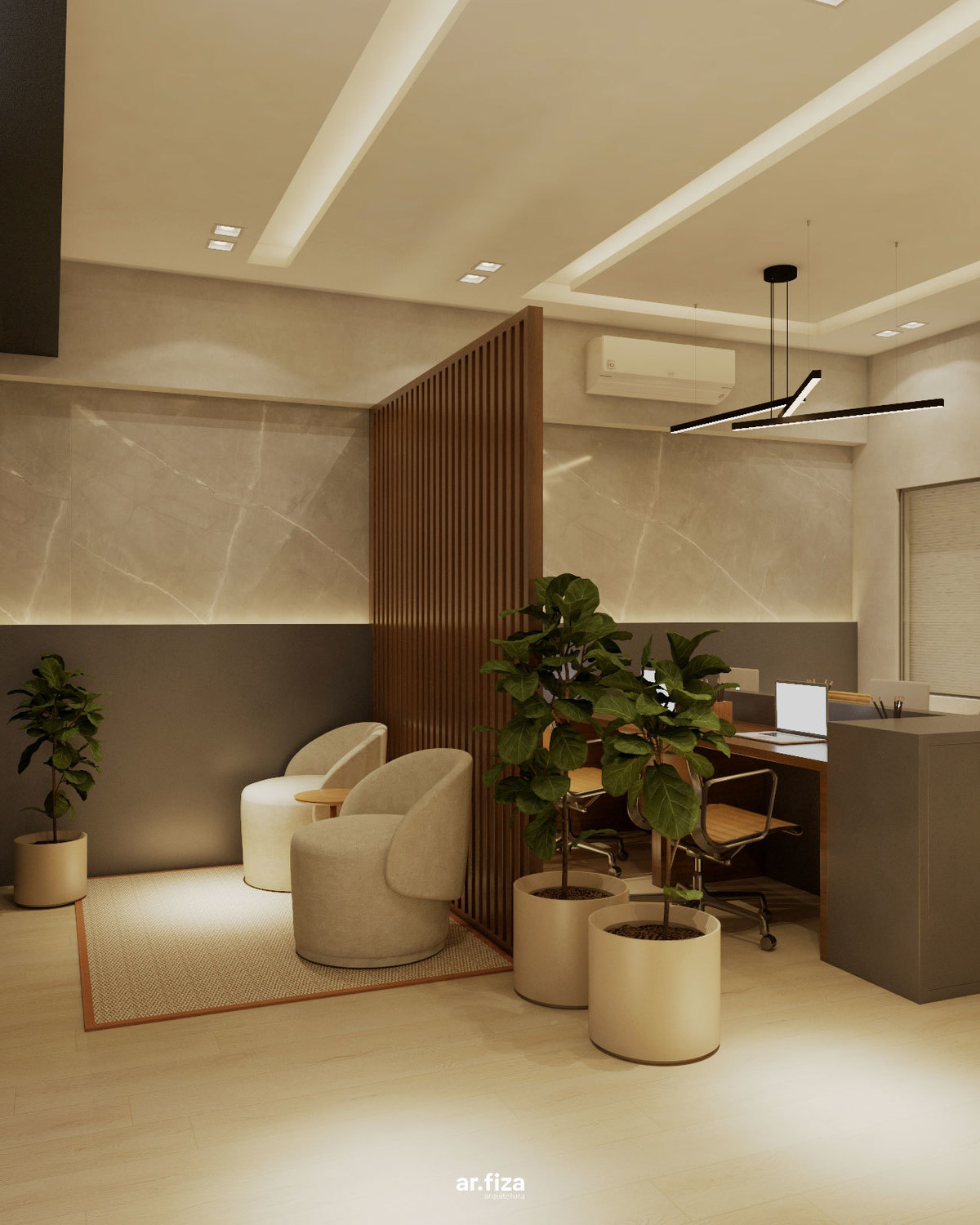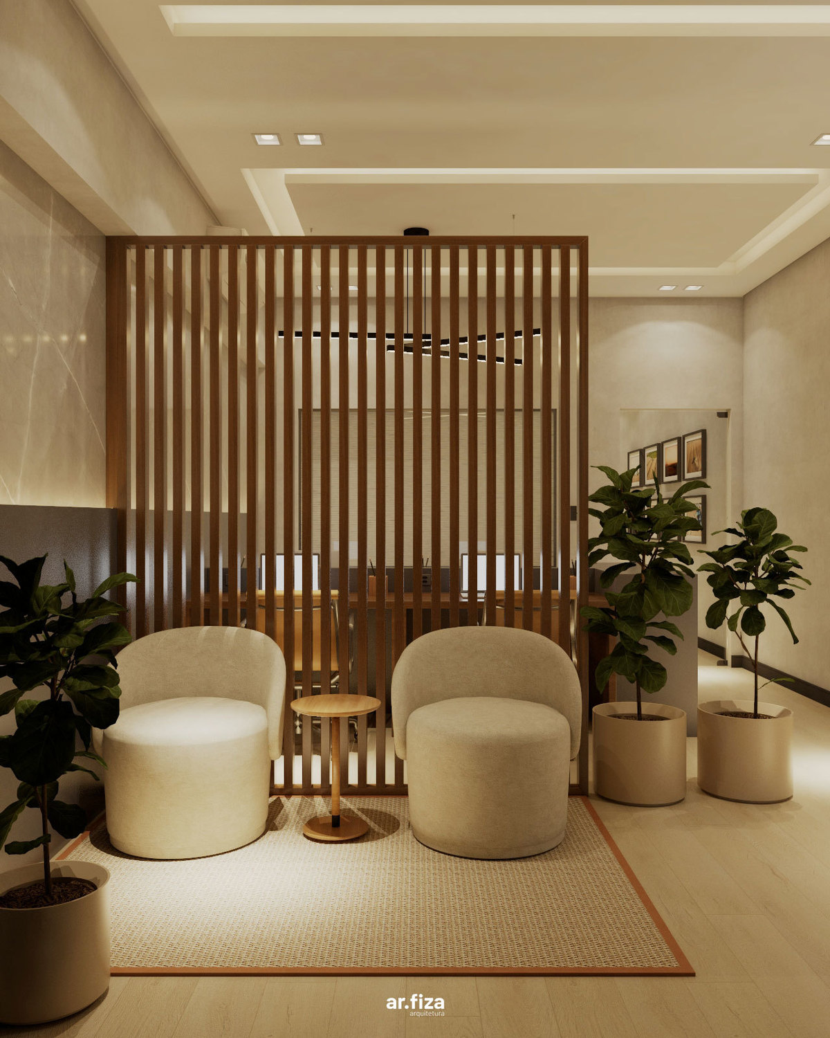 Desde a recepção, o espaço foi pensado para comunicar profissionalismo, acolhimento e confiança. A área de atendimento e a sala de trabalho da equipe se conectam de forma fluida através de um ripado leve e elegante, que garante integração visual sem abrir mão da privacidade necessária para o dia a dia do trabalho.