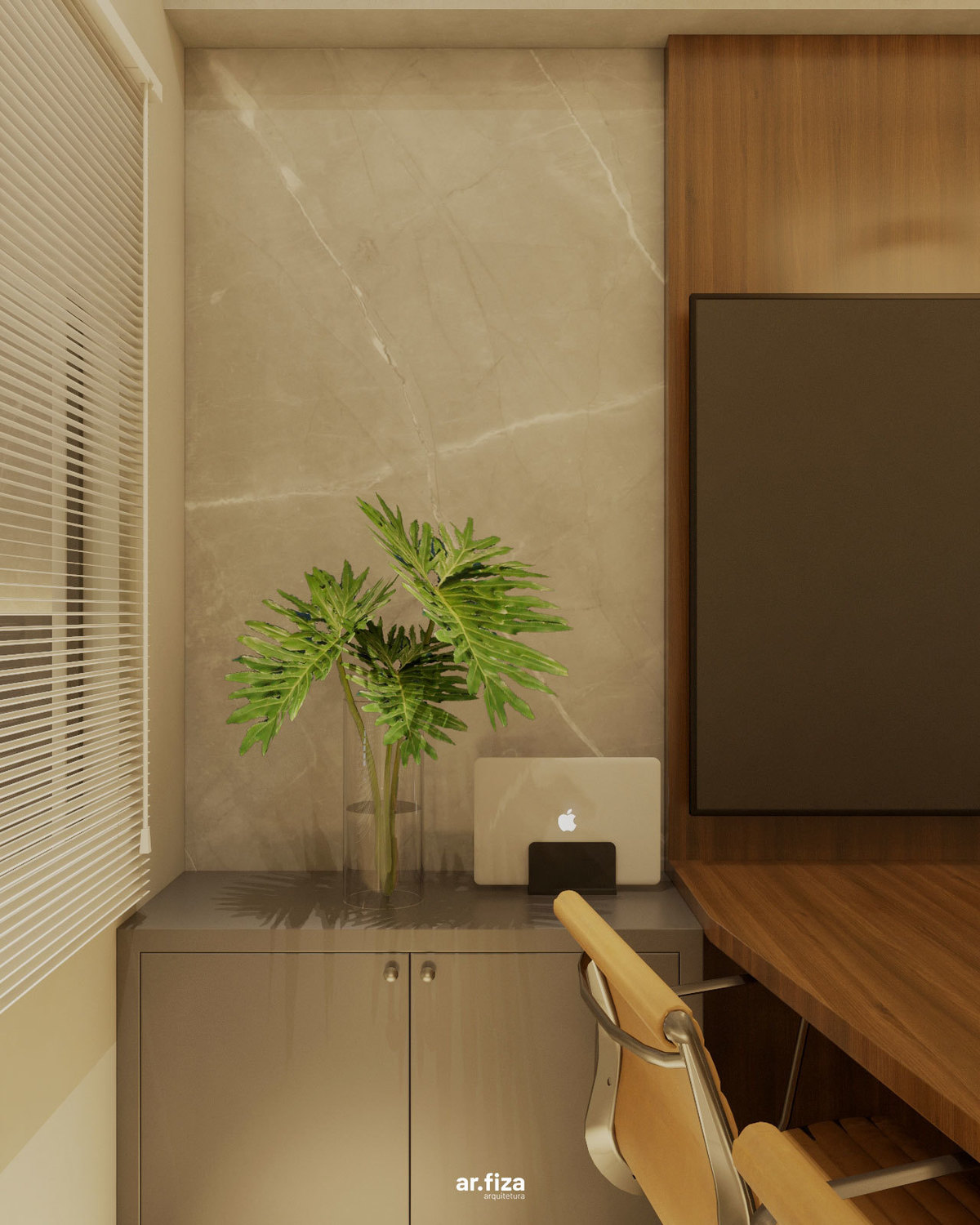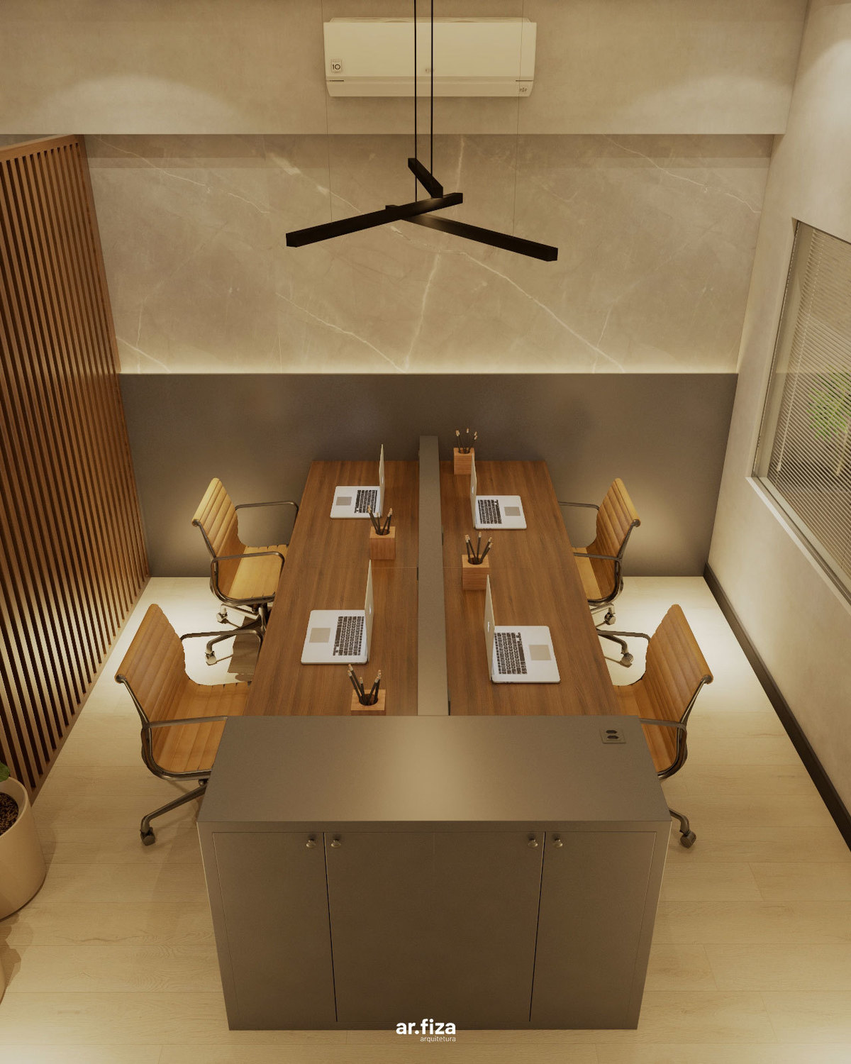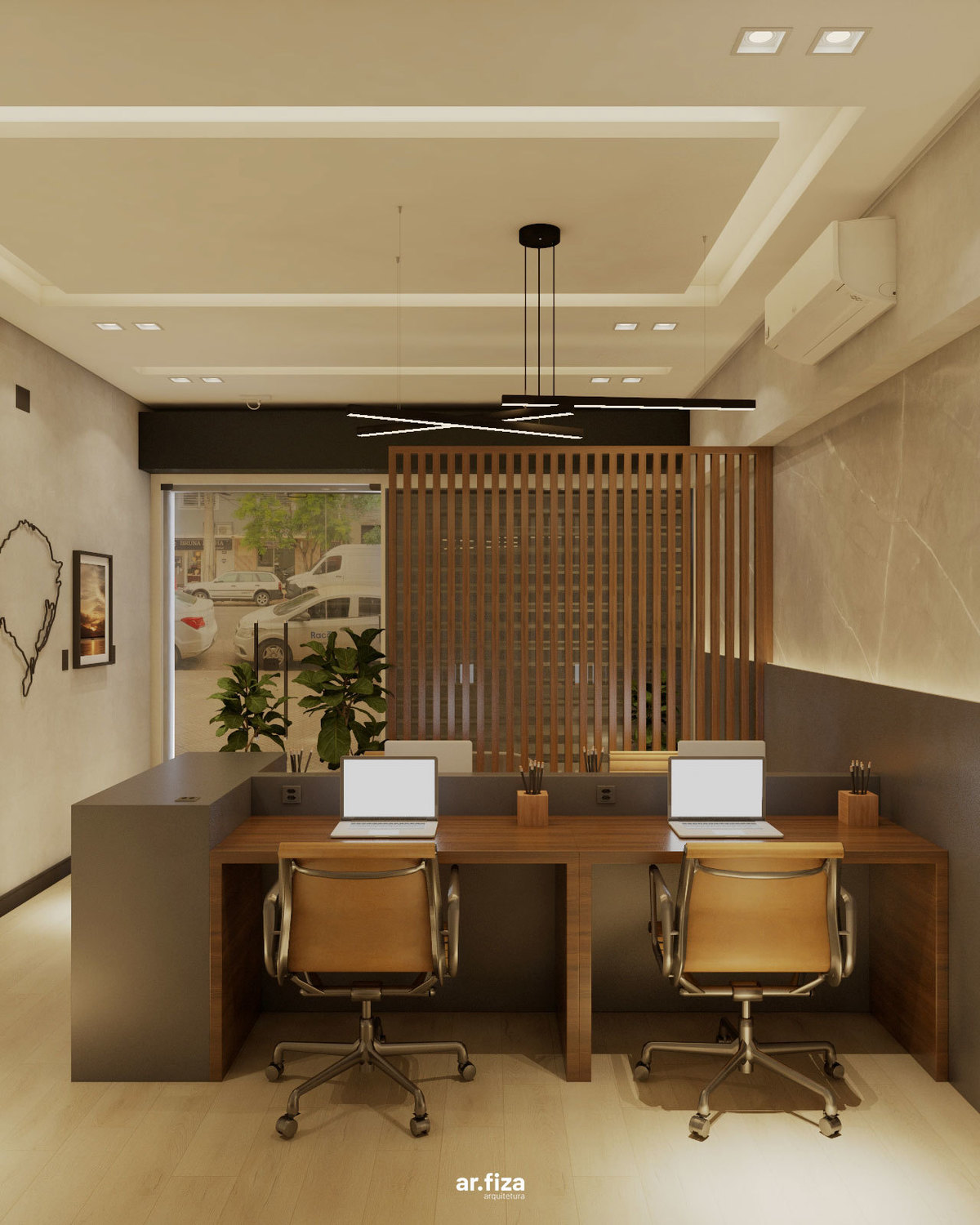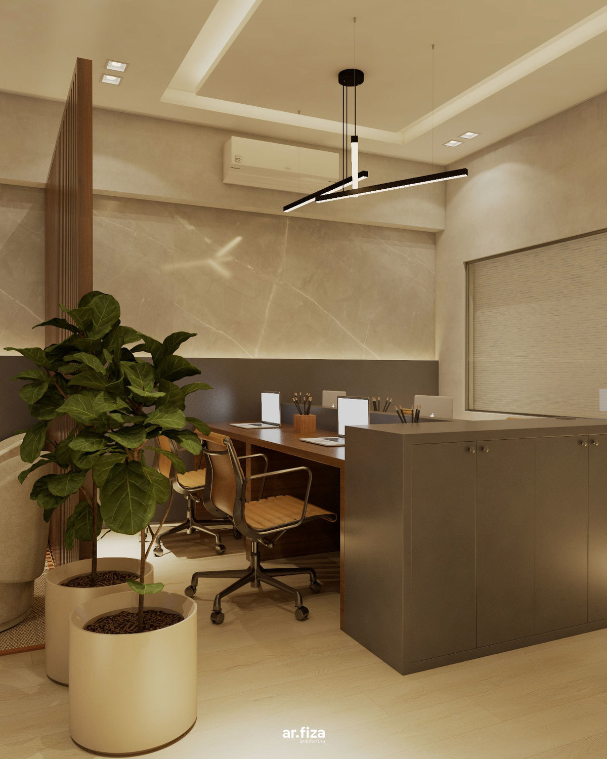 Desde a recepção, o espaço foi pensado para comunicar profissionalismo, acolhimento e confiança. A área de atendimento e a sala de trabalho da equipe se conectam de forma fluida através de um ripado leve e elegante, que garante integração visual sem abrir mão da privacidade necessária para o dia a dia do trabalho.