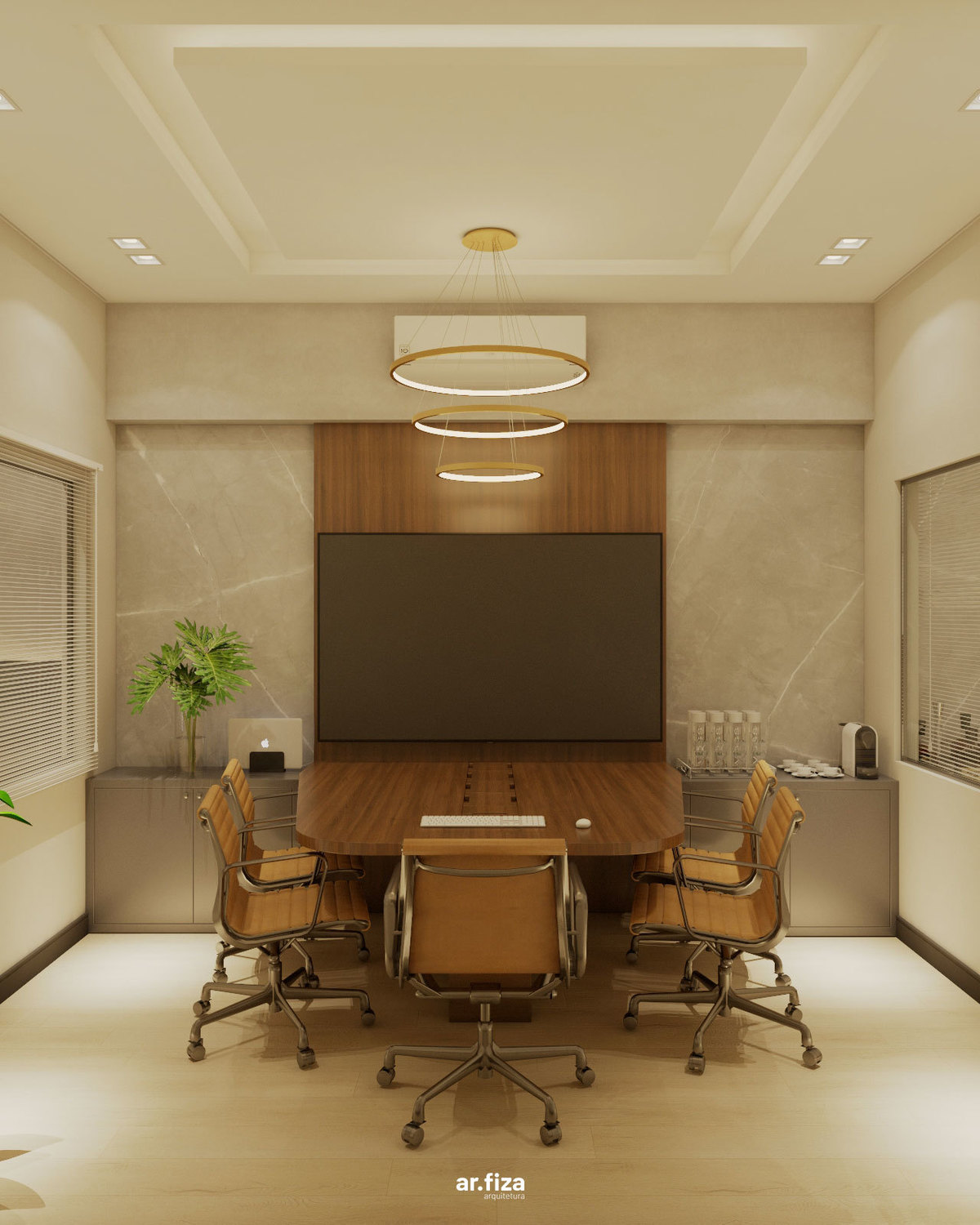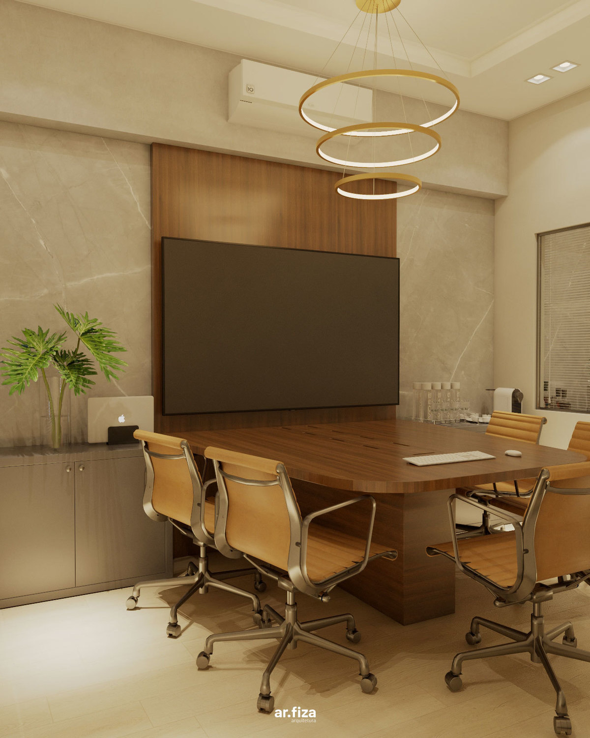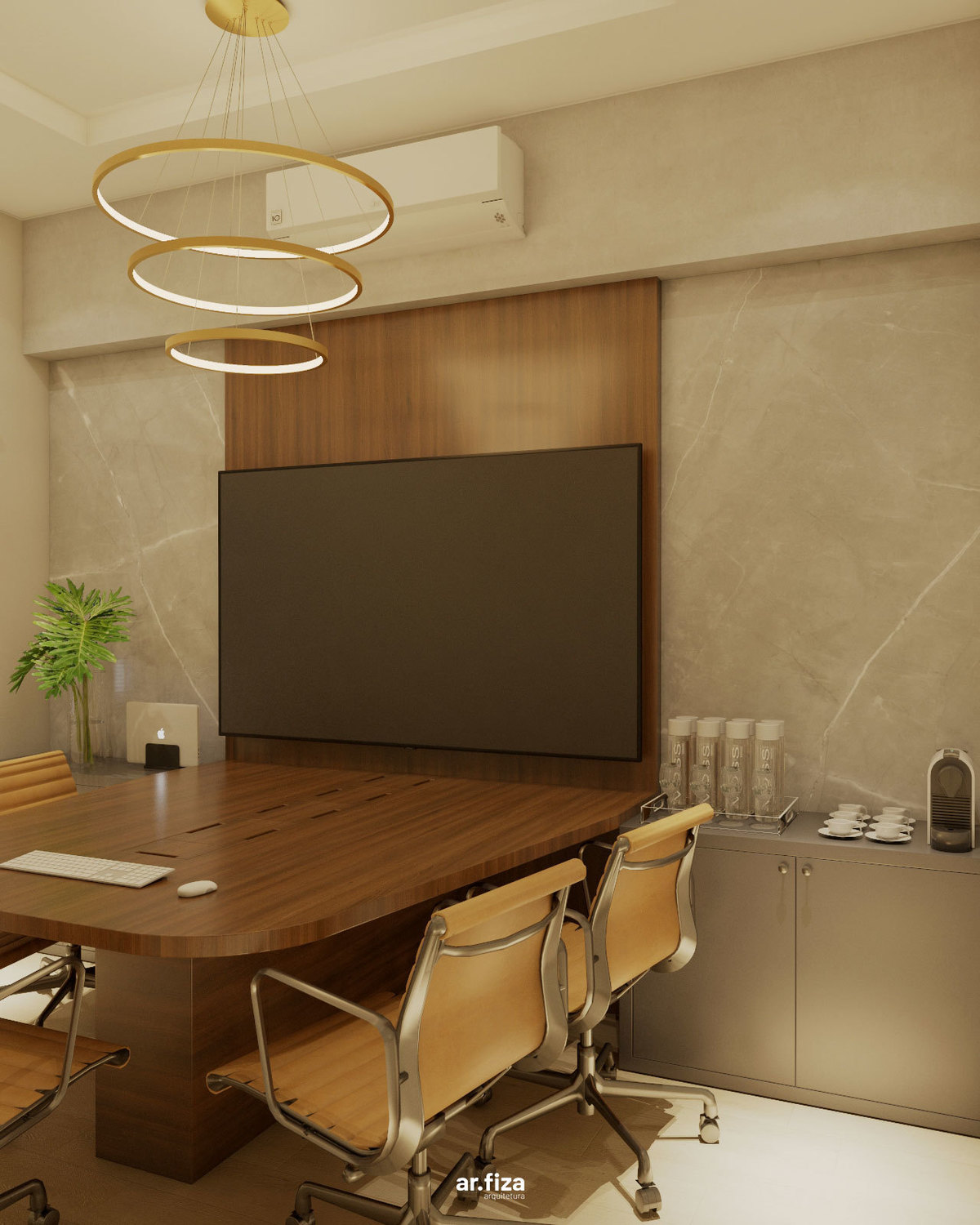 No centro das decisões estratégicas está a sala de reuniões e conferências, projetada para receber encontros importantes e conduzir as principais definições da empresa na região. Tons sóbrios, iluminação precisa e um design contemporâneo criam um ambiente sofisticado e funcional, adequado para momentos de análise, planejamento e tomada de decisão.