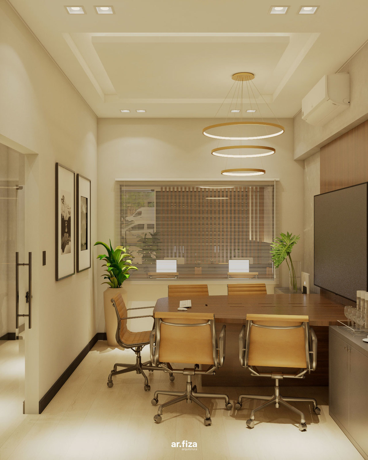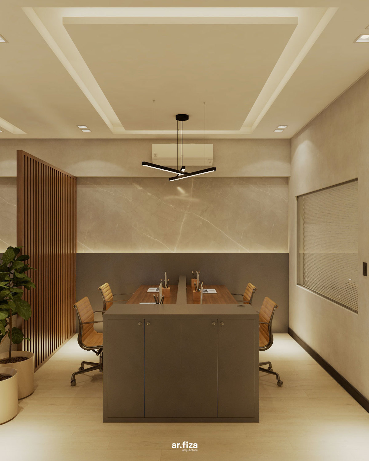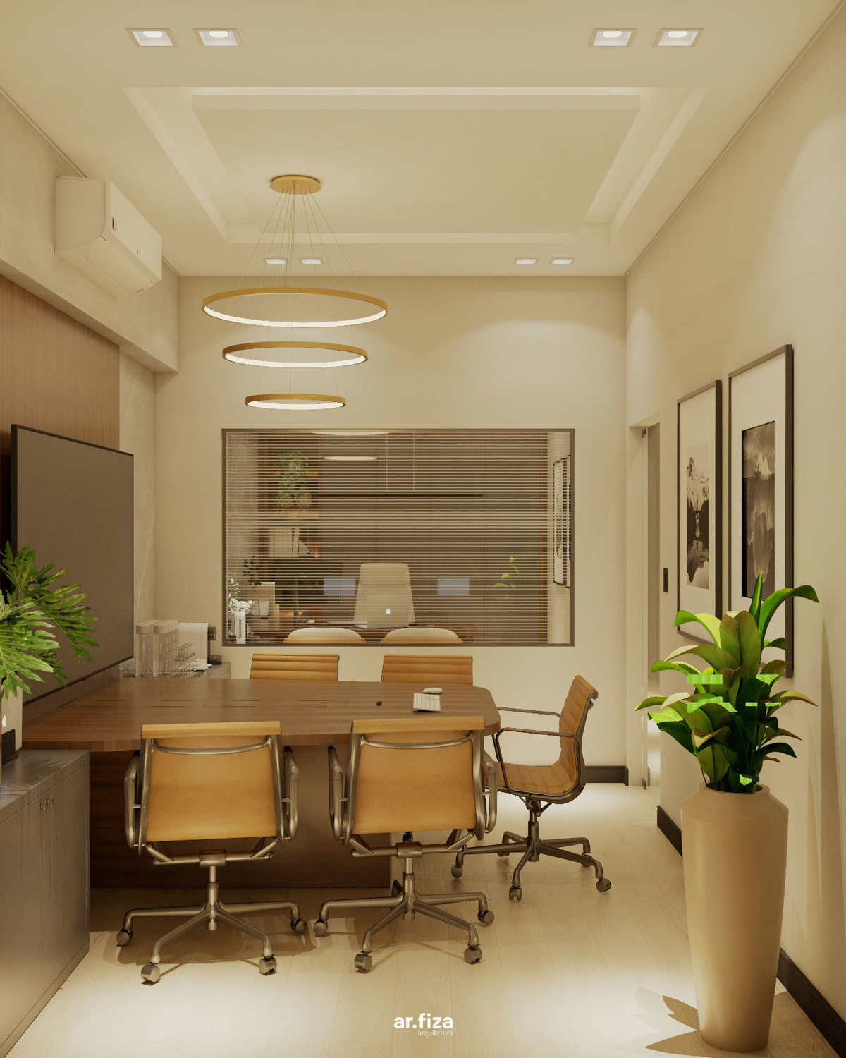 No centro das decisões estratégicas está a sala de reuniões e conferências, projetada para receber encontros importantes e conduzir as principais definições da empresa na região. Tons sóbrios, iluminação precisa e um design contemporâneo criam um ambiente sofisticado e funcional, adequado para momentos de análise, planejamento e tomada de decisão.