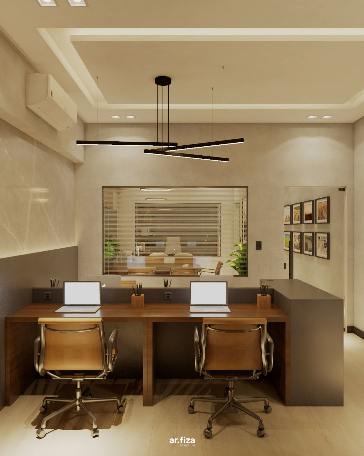 A integração entre os ambientes é reforçada pelos grandes vitrôs que conectam visualmente as salas do escritório, criando uma sensação de unidade, transparência e colaboração entre toda a equipe. Quando necessário, cortinas discretas permitem garantir privacidade nos momentos que exigem maior concentração ou confidencialidade.