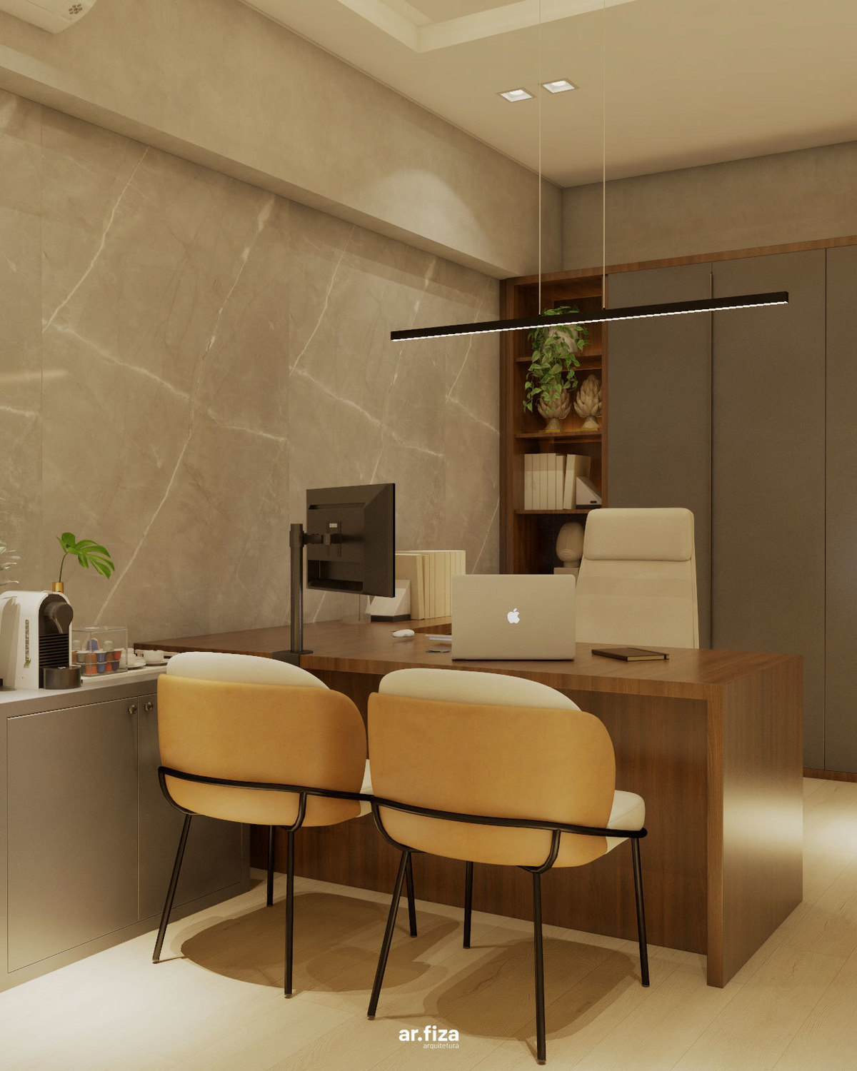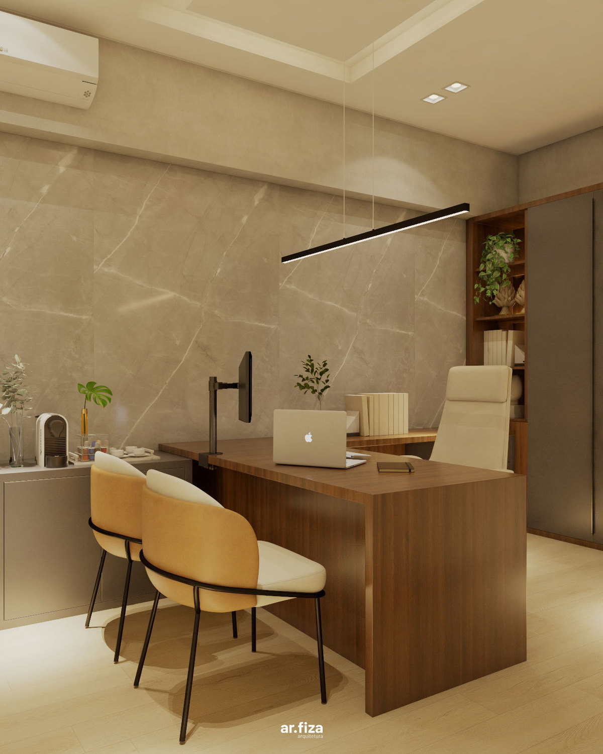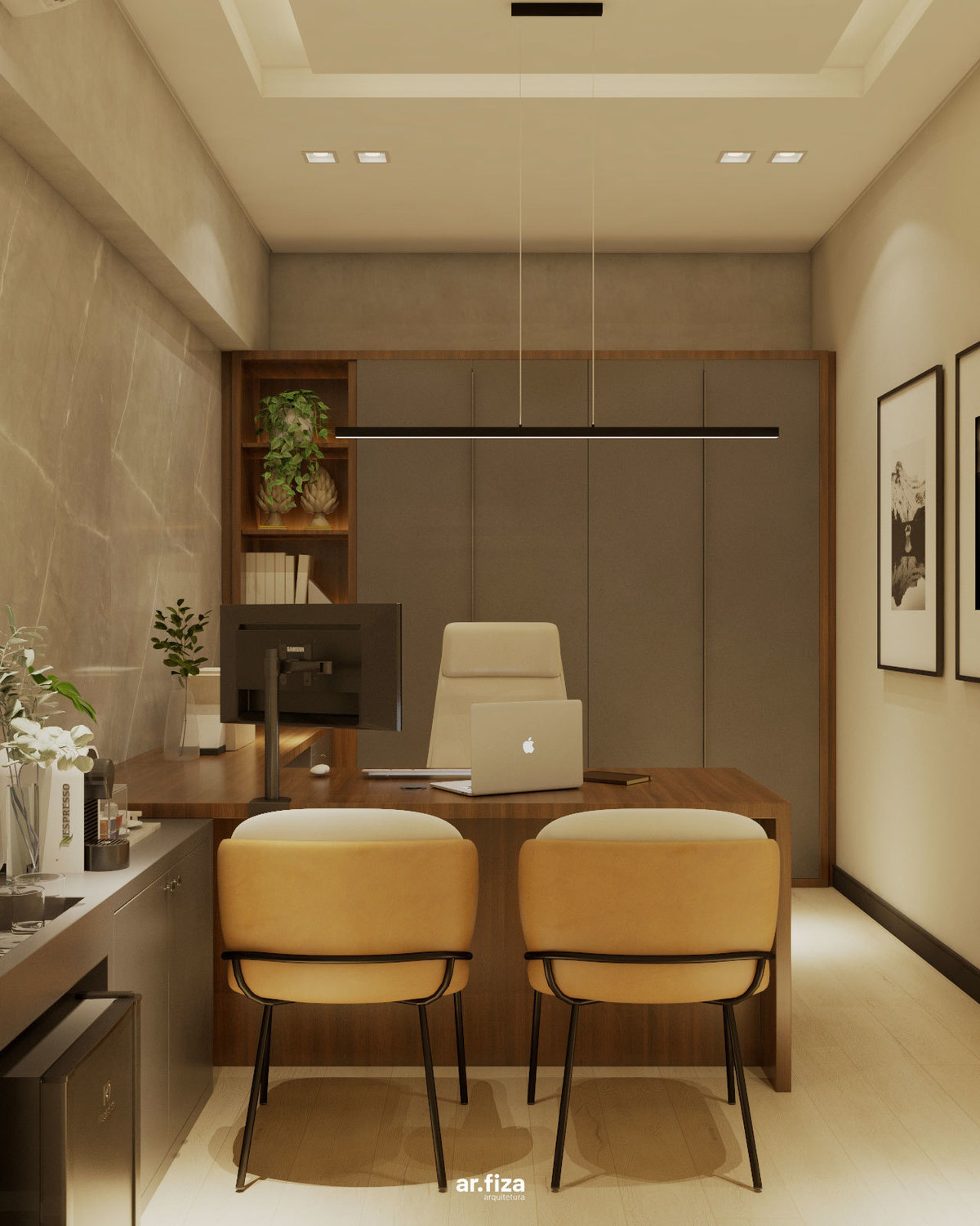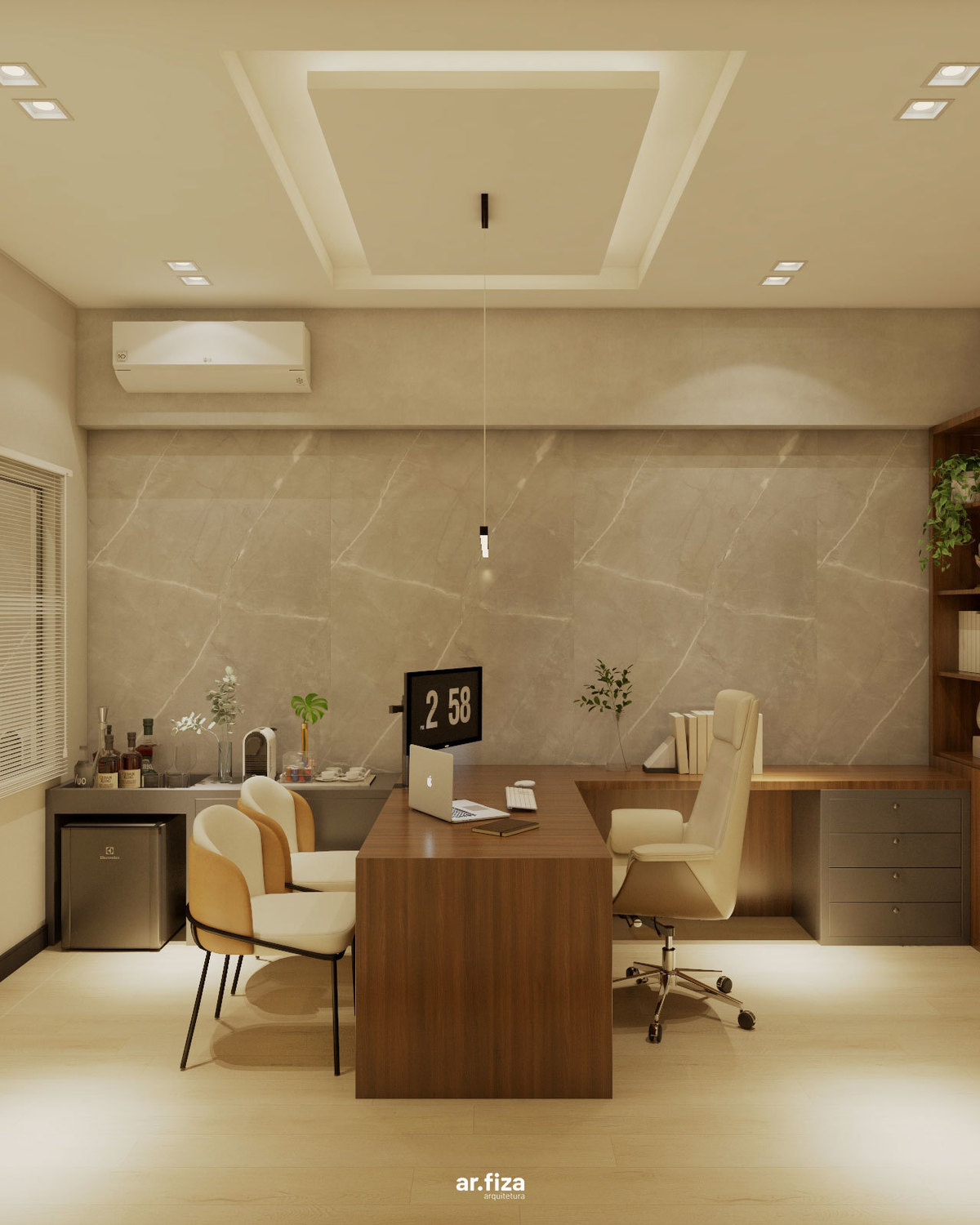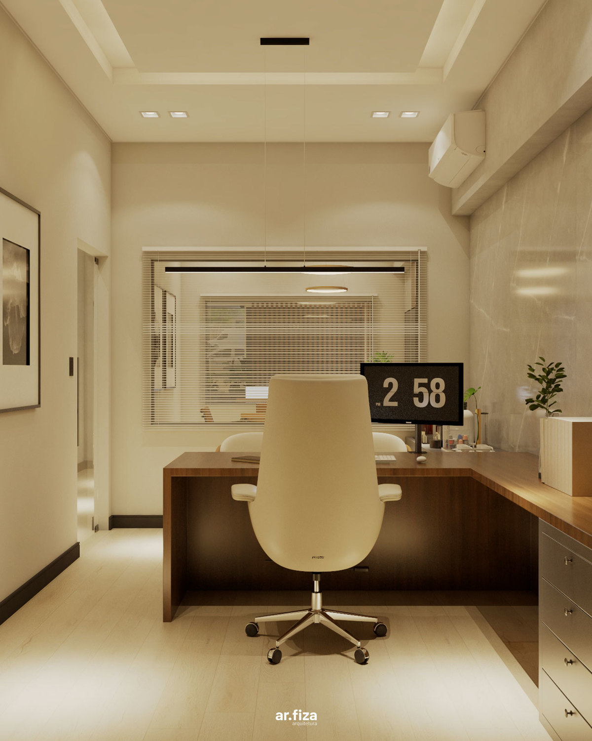 A sala do diretor complementa o conjunto com uma atmosfera que equilibra liderança, elegância e conforto. Linhas puras, materiais nobres e uma marcenaria sob medida organizam o espaço com sofisticação, enquanto a iluminação cênica valoriza cada detalhe e reforça a identidade corporativa do ambiente.