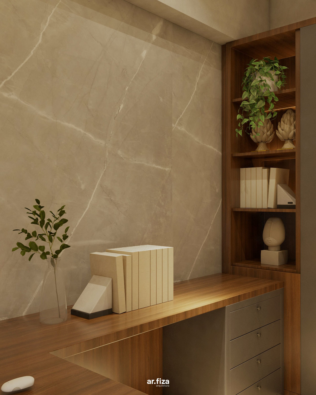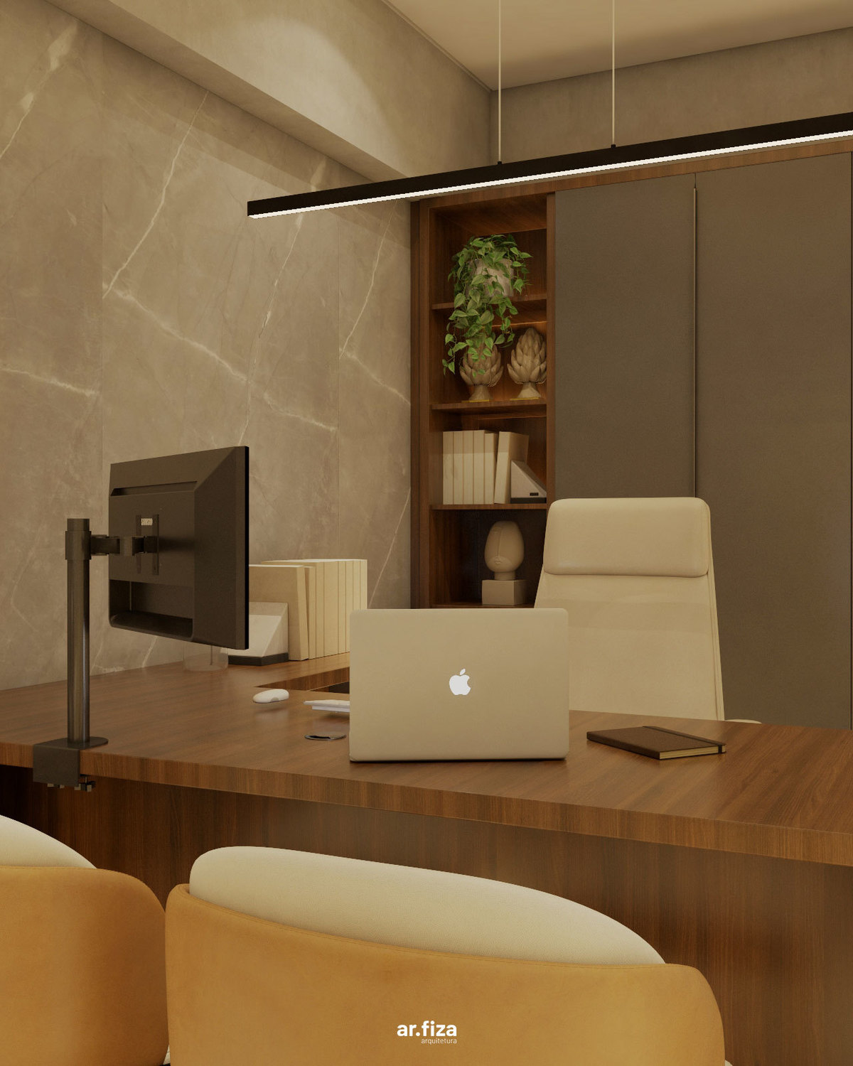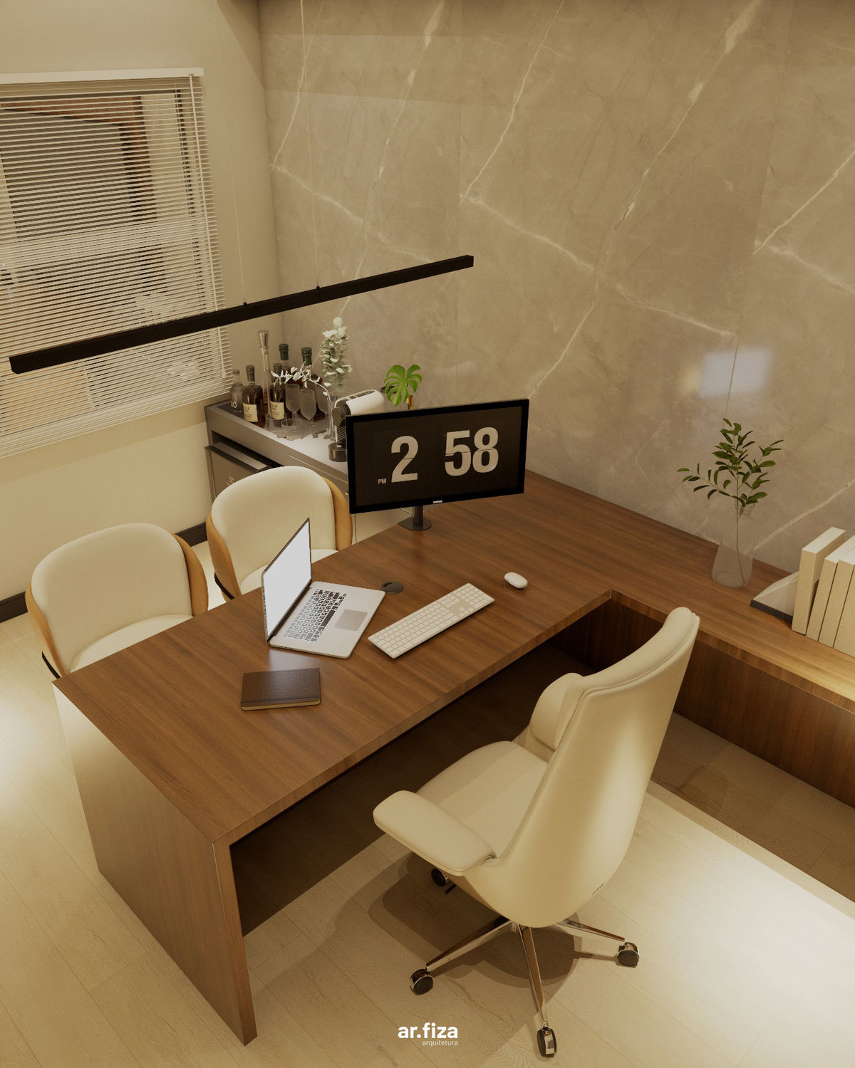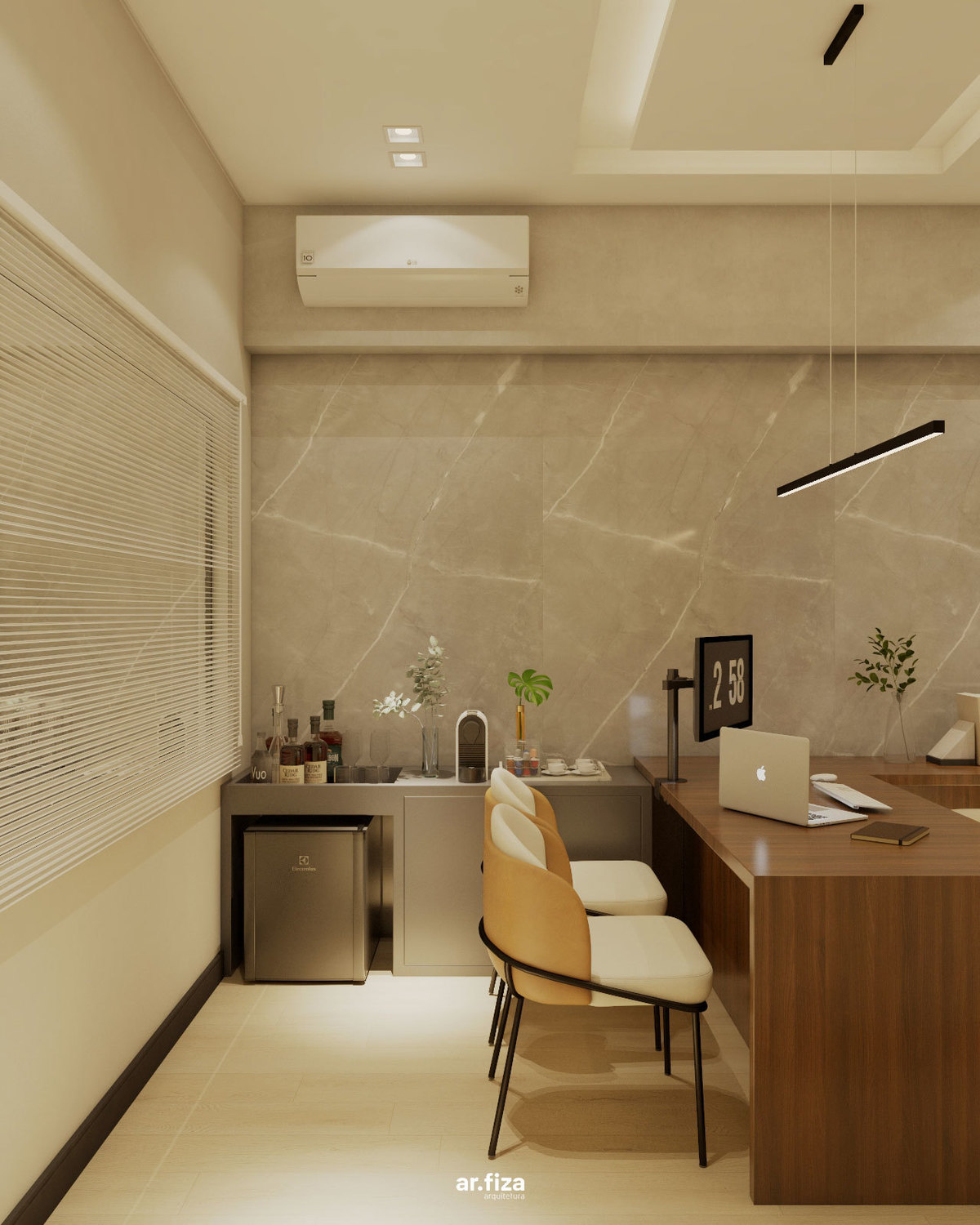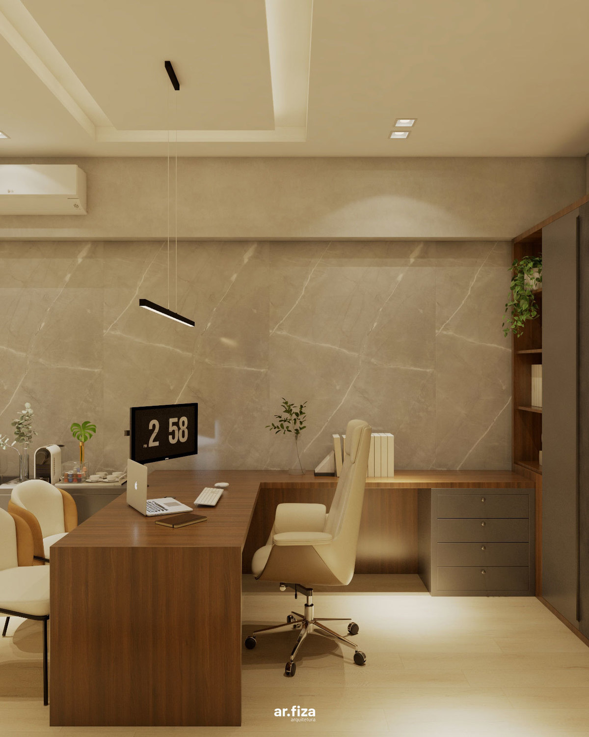 A sala do diretor complementa o conjunto com uma atmosfera que equilibra liderança, elegância e conforto. Linhas puras, materiais nobres e uma marcenaria sob medida organizam o espaço com sofisticação, enquanto a iluminação cênica valoriza cada detalhe e reforça a identidade corporativa do ambiente.