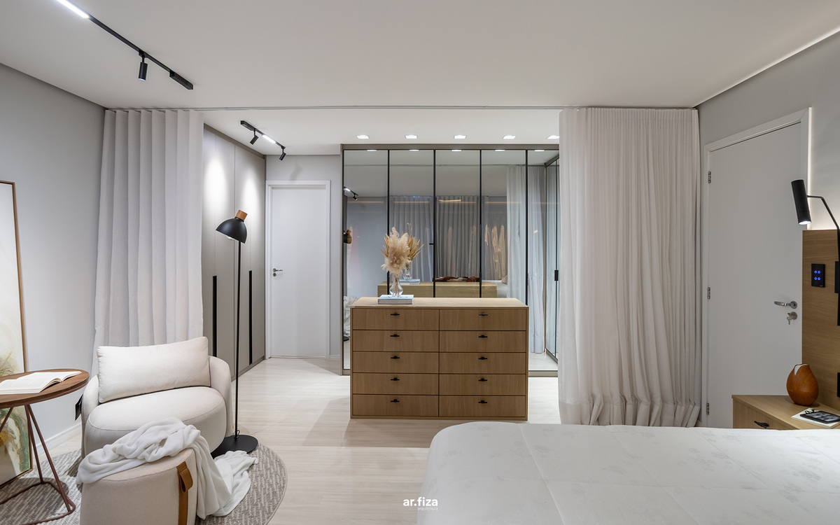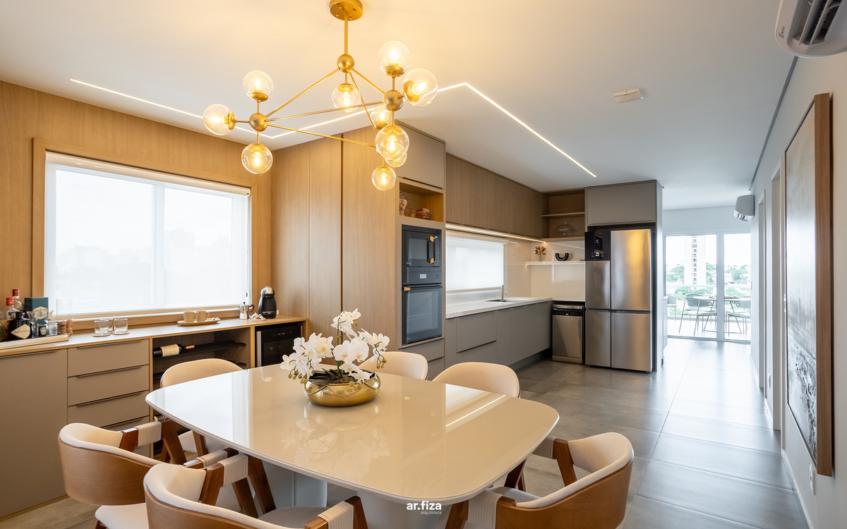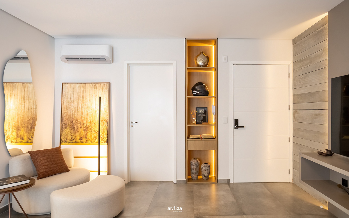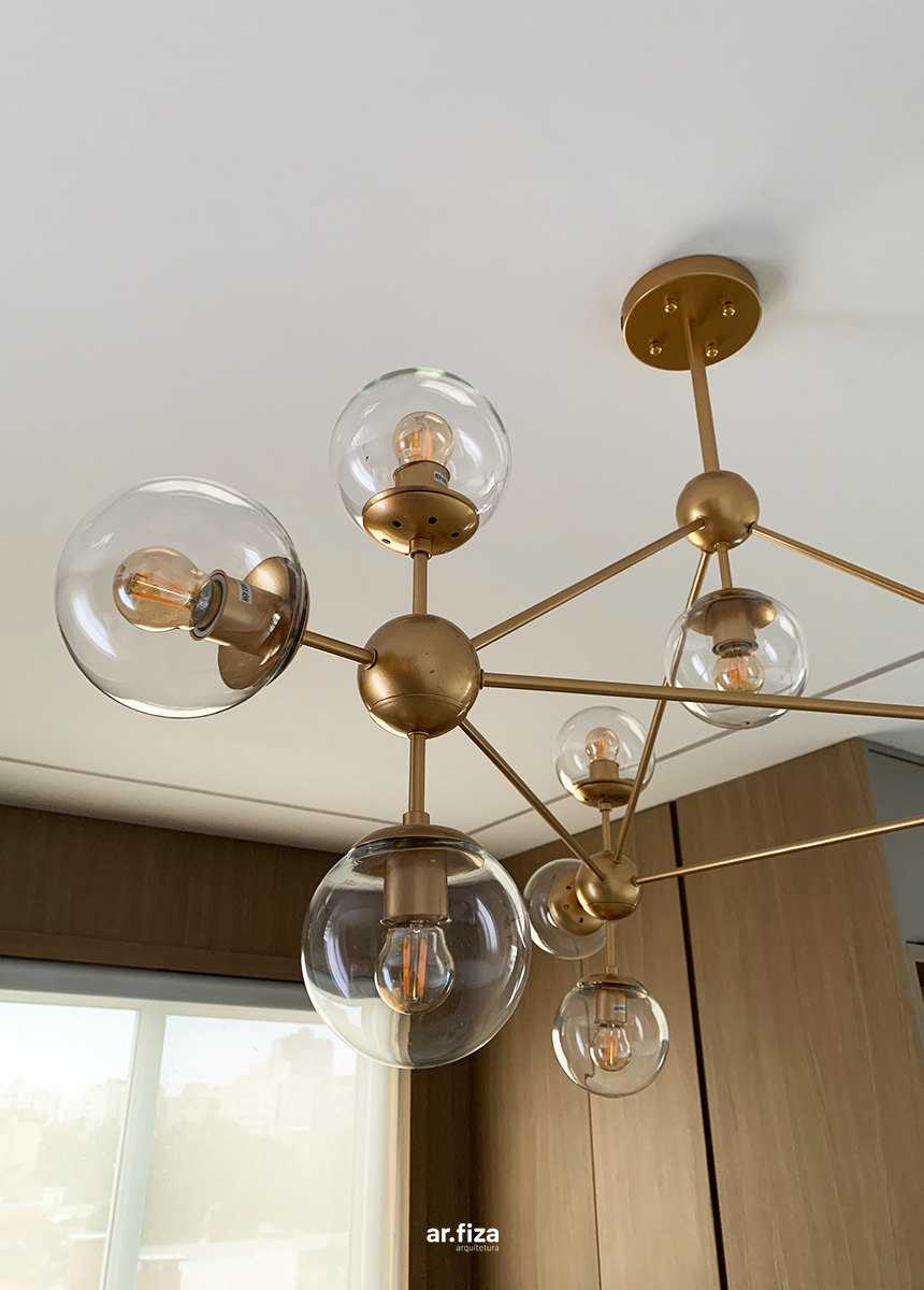 A prioridade para o cliente era que o apartamento tivesse áreas de circulações fluidas e que o design evidenciasse a amplitude da planta. Outro pedido importante foi um projeto de iluminação com luzes aconchegantes e indiretas que valorizassem a marcenaria, os móveis soltos e as decorações. Para o teto foram selecionados itens pontuais criando assim um forro com visual limpo, realçando a sensação de amplitude.