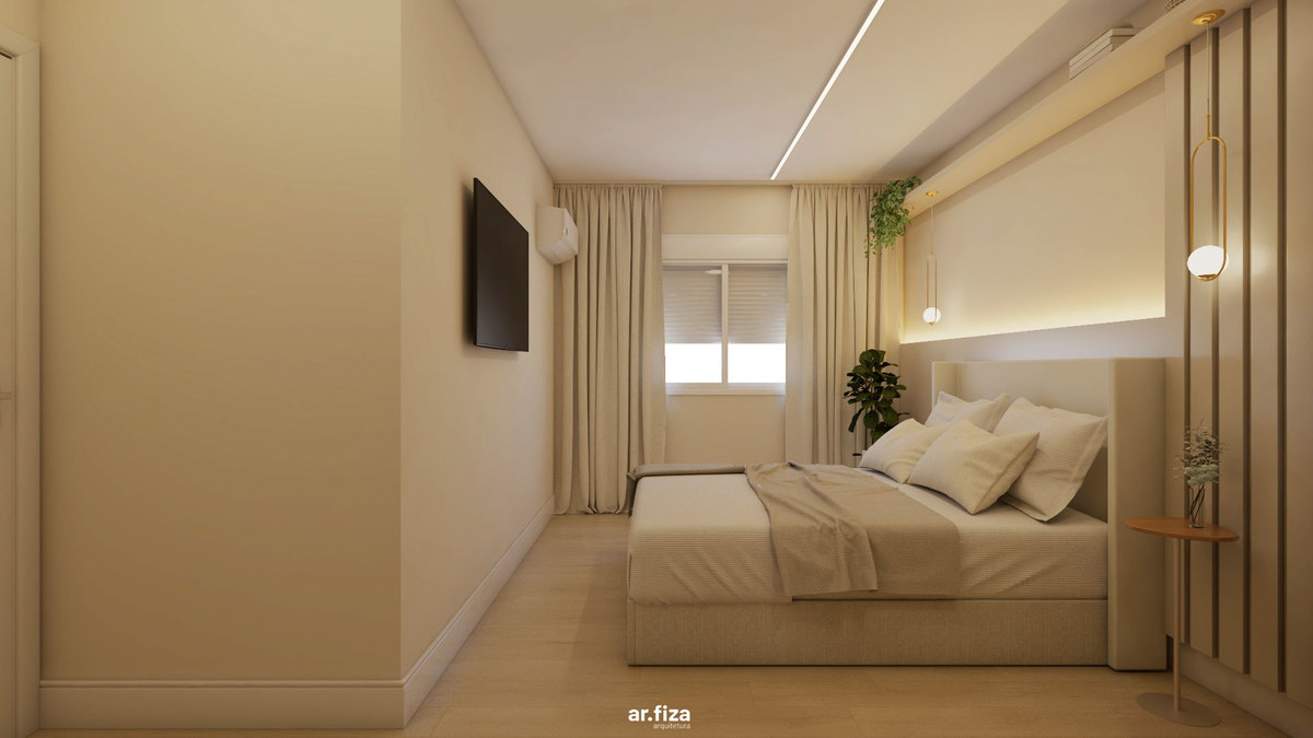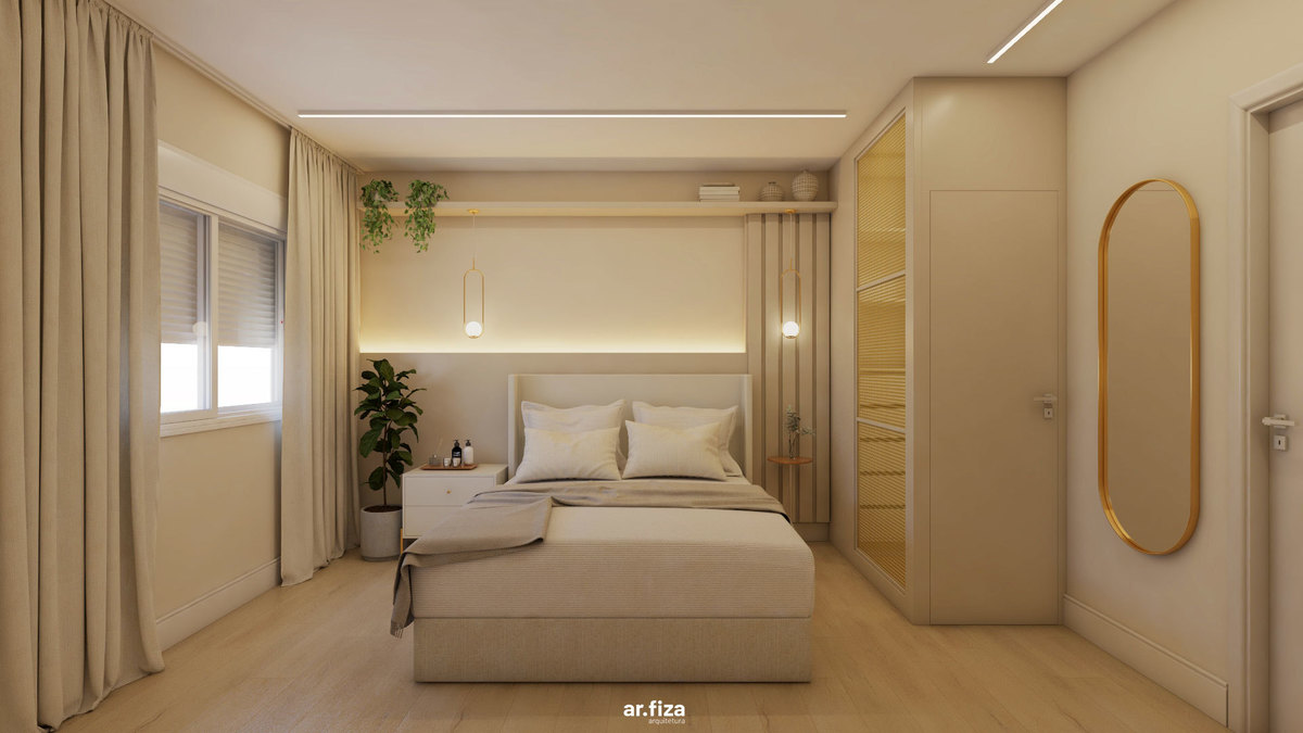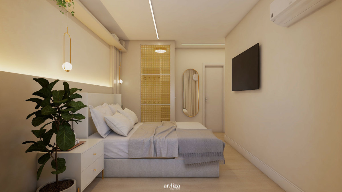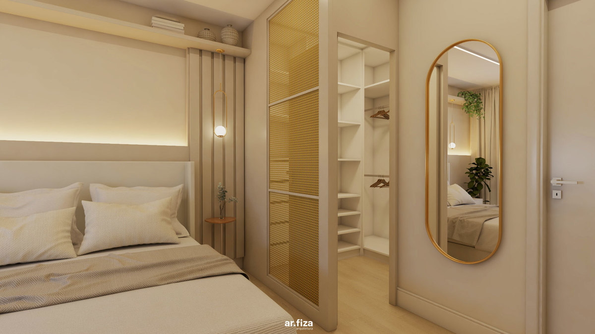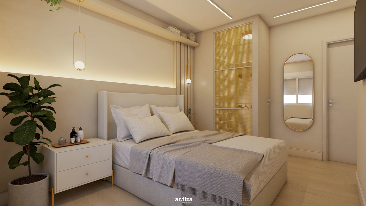 Na área íntima, a paleta neutra em tons suaves, as texturas aconchegantes e a divisória em palhinha natural criam um refúgio leve e elegante. O dormitório principal foi pensado para promover bem-estar, unindo design, funcionalidade e delicadeza.