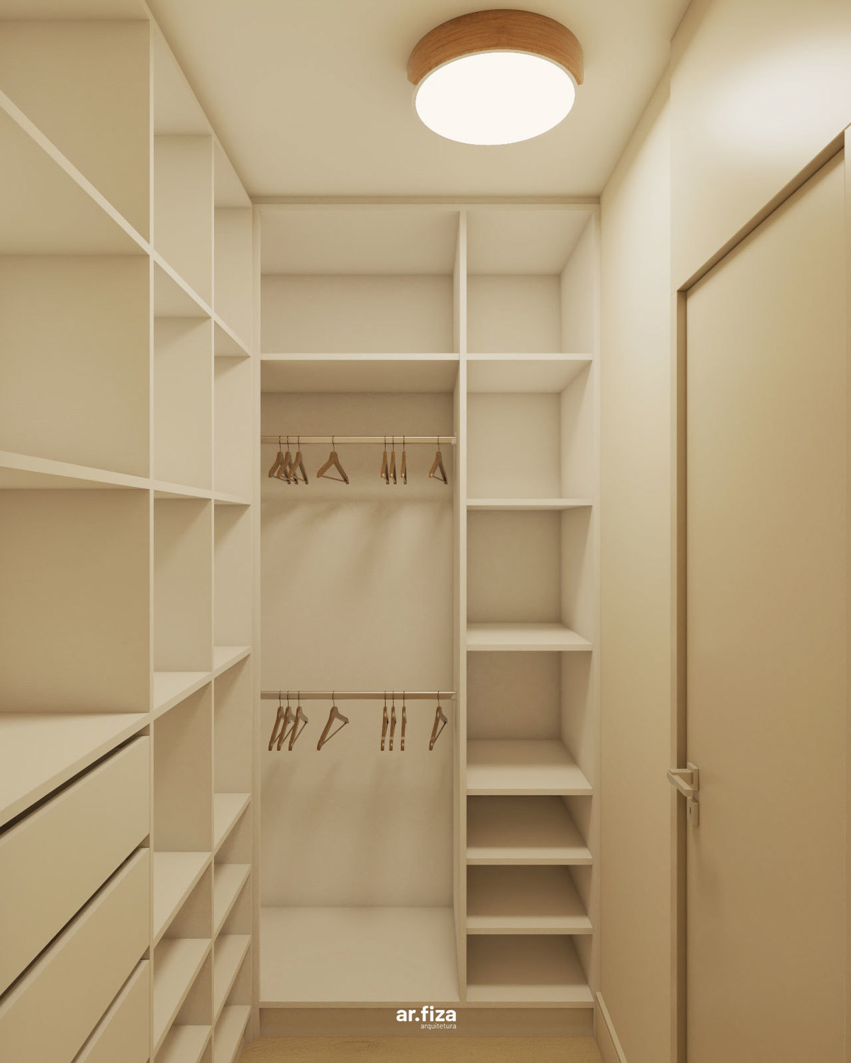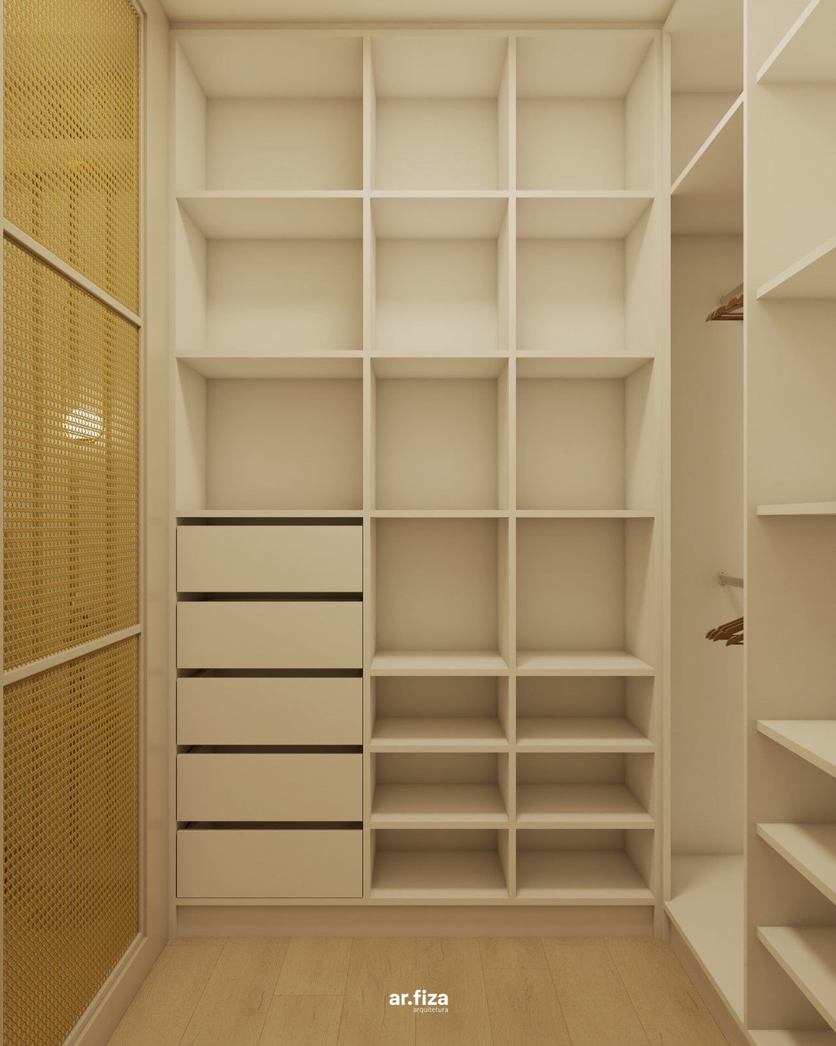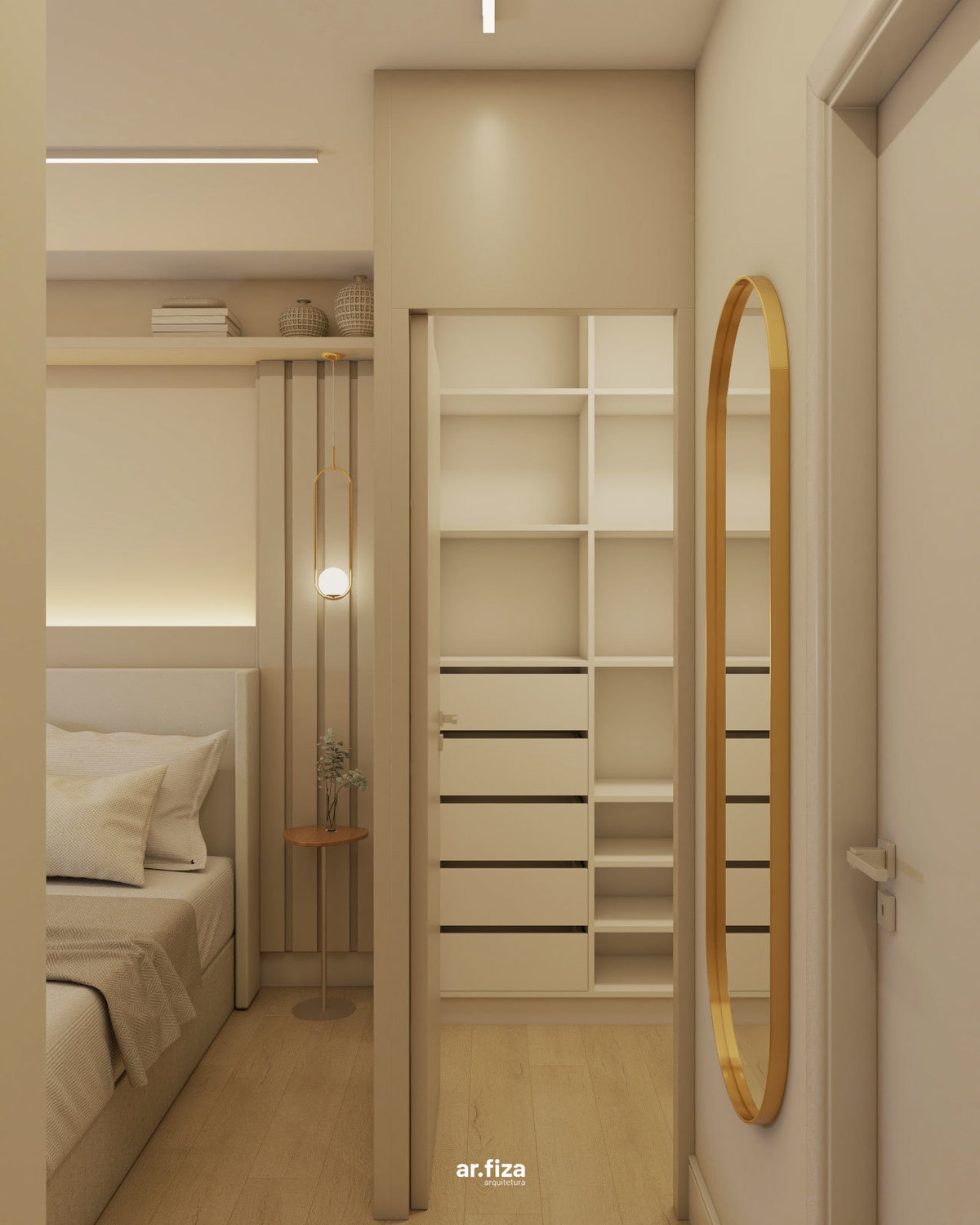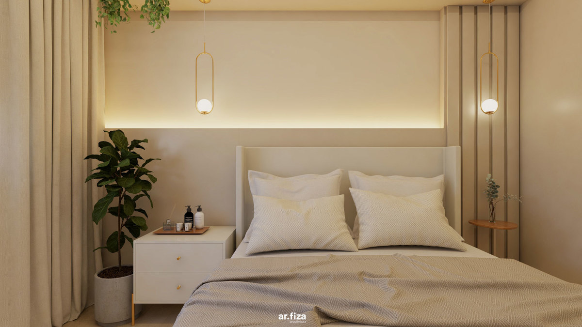Na área íntima, a paleta neutra em tons suaves, as texturas aconchegantes e a divisória em palhinha natural criam um refúgio leve e elegante. O dormitório principal foi pensado para promover bem-estar, unindo design, funcionalidade e delicadeza.