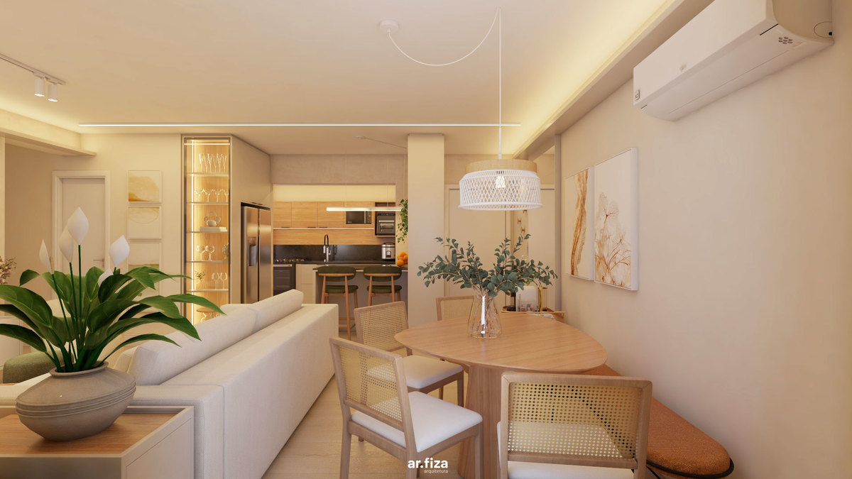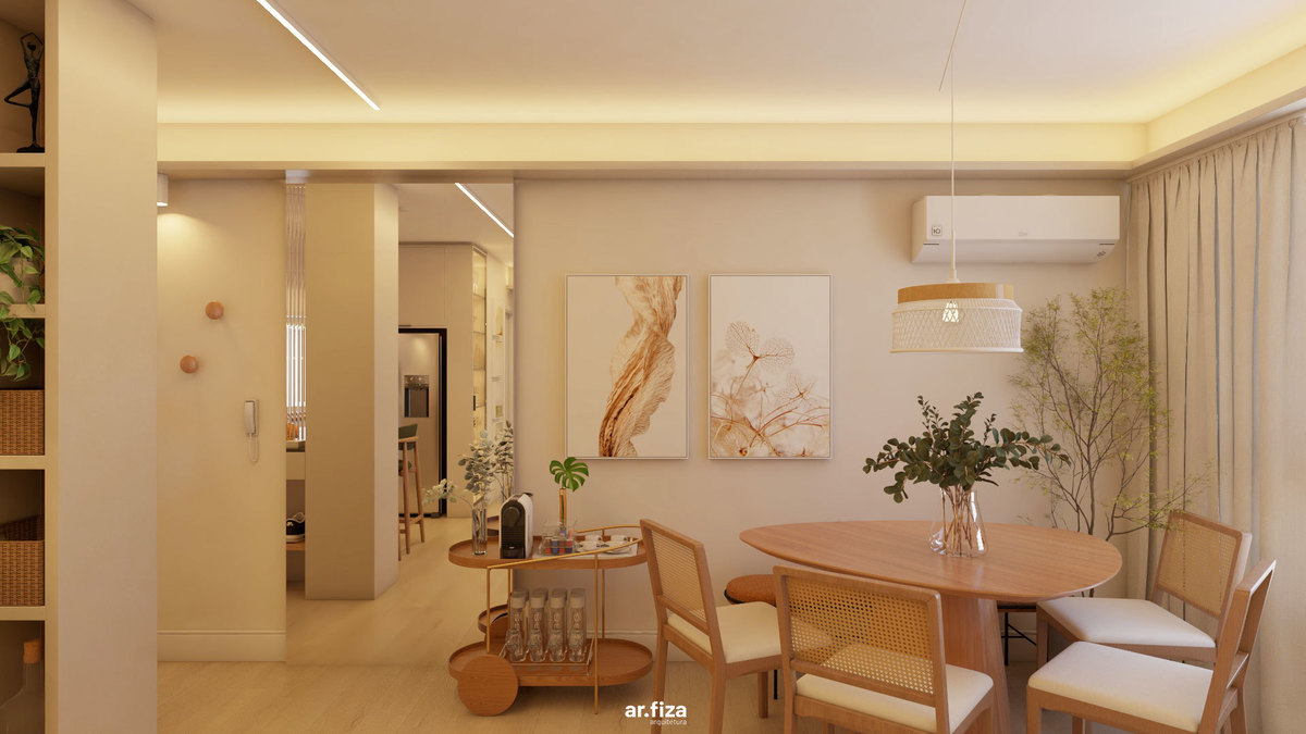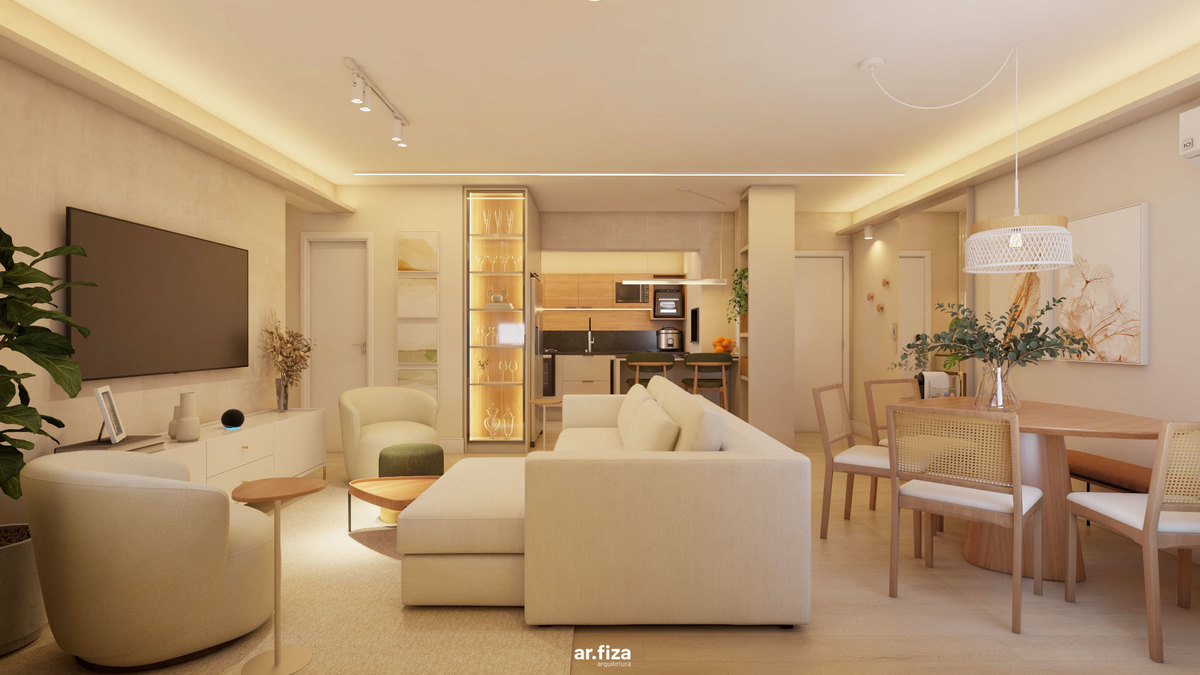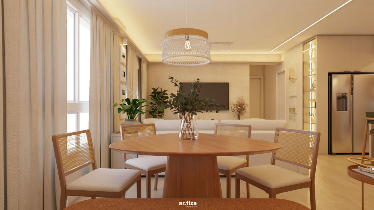 Desde o hall de entrada, a arquitetura acolhe. Elementos funcionais se tornam gestos de hospitalidade: a marcenaria sob medida organiza o dia a dia com leveza, o vidro canelado filtra a luz natural e o carrinho bar recebe quem chega com charme e afeto. A área social foi desenhada para integrar sala de estar, jantar e cozinha de forma fluida e inteligente. O sofá generoso com chaise retrátil, as poltronas giratórias e os pufes ampliam as possibilidades de uso, permitindo que os espaços conversem entre si. A mesa orgânica da sala de jantar, acompanhada pelo banco encostado na parede e cadeiras em madeira e palha, reforça a atmosfera acolhedora e convida à convivência.