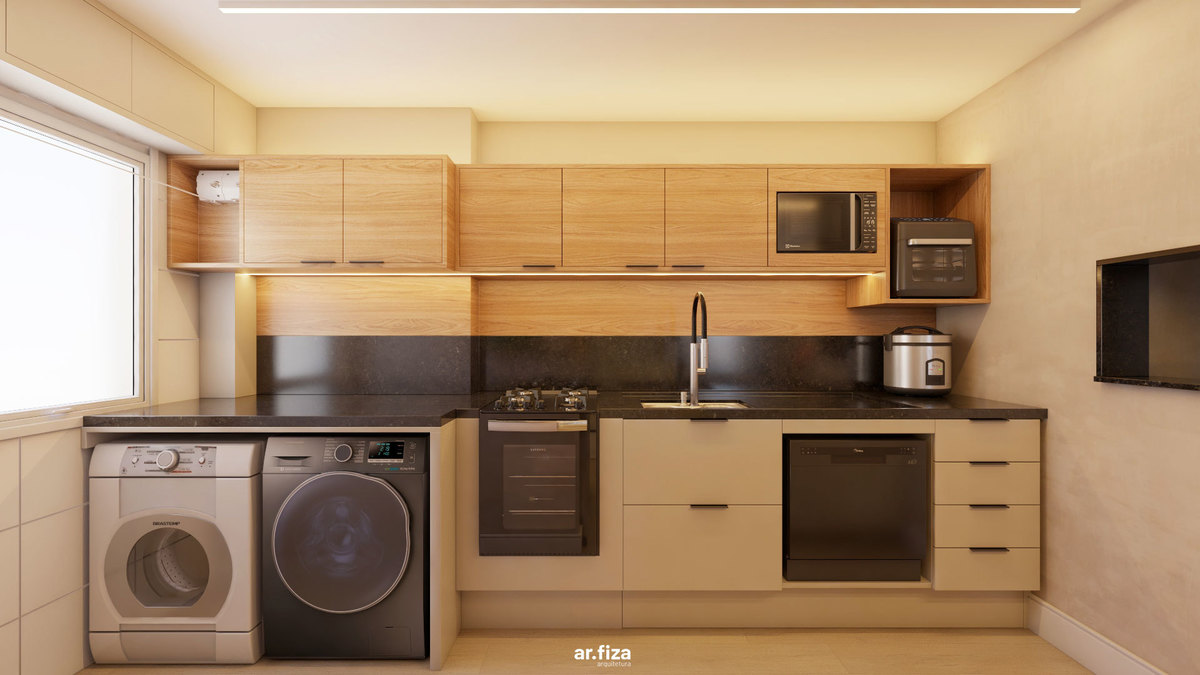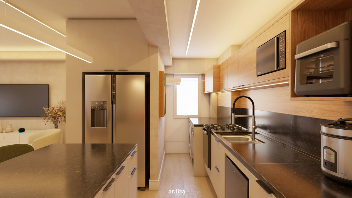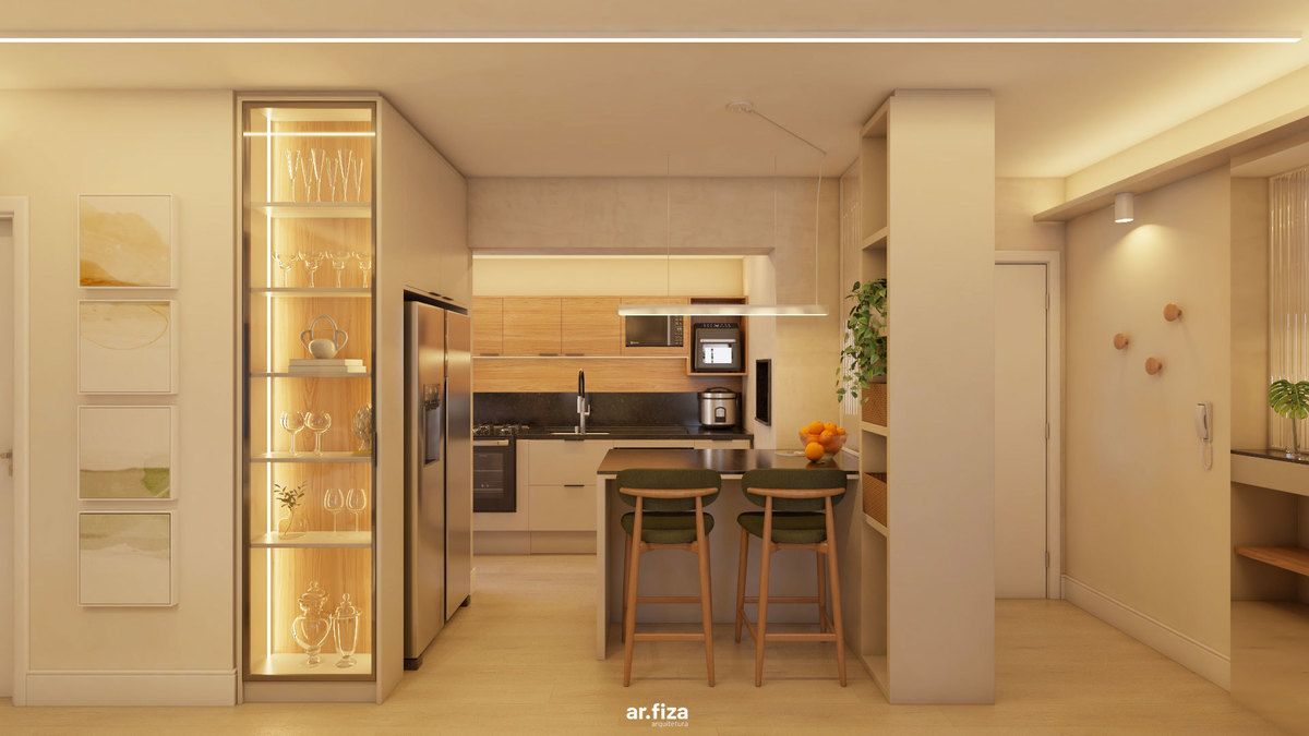 Na cozinha, funcionalidade e estética caminham juntas. A ilha com pedra preta, o pendente linear e a cristaleira iluminada com fundo amadeirado traduzem sofisticação prática — onde cada elemento tem propósito e cada detalhe conta uma história.