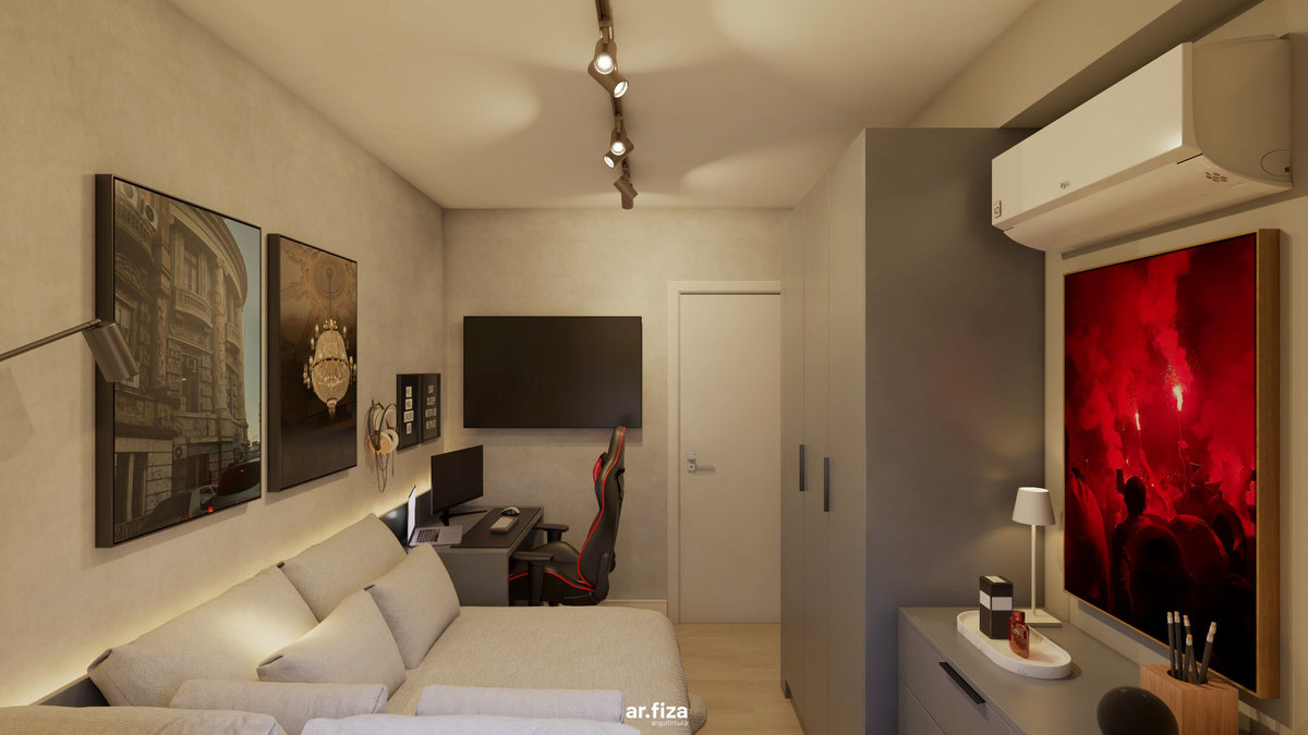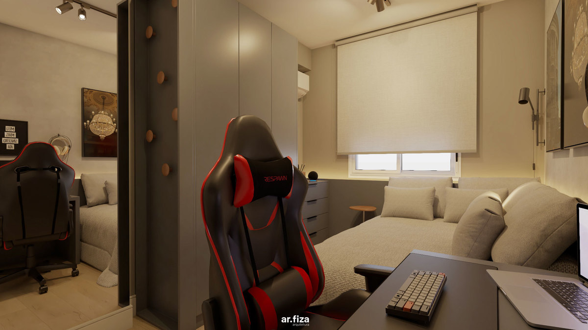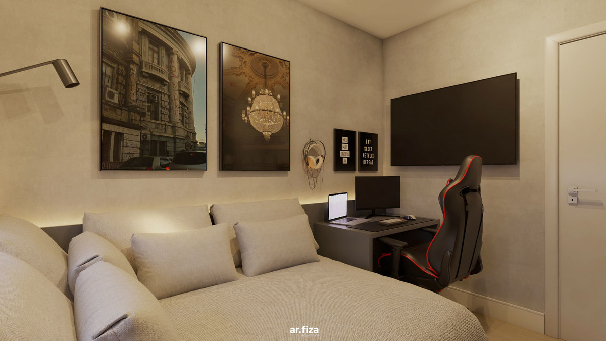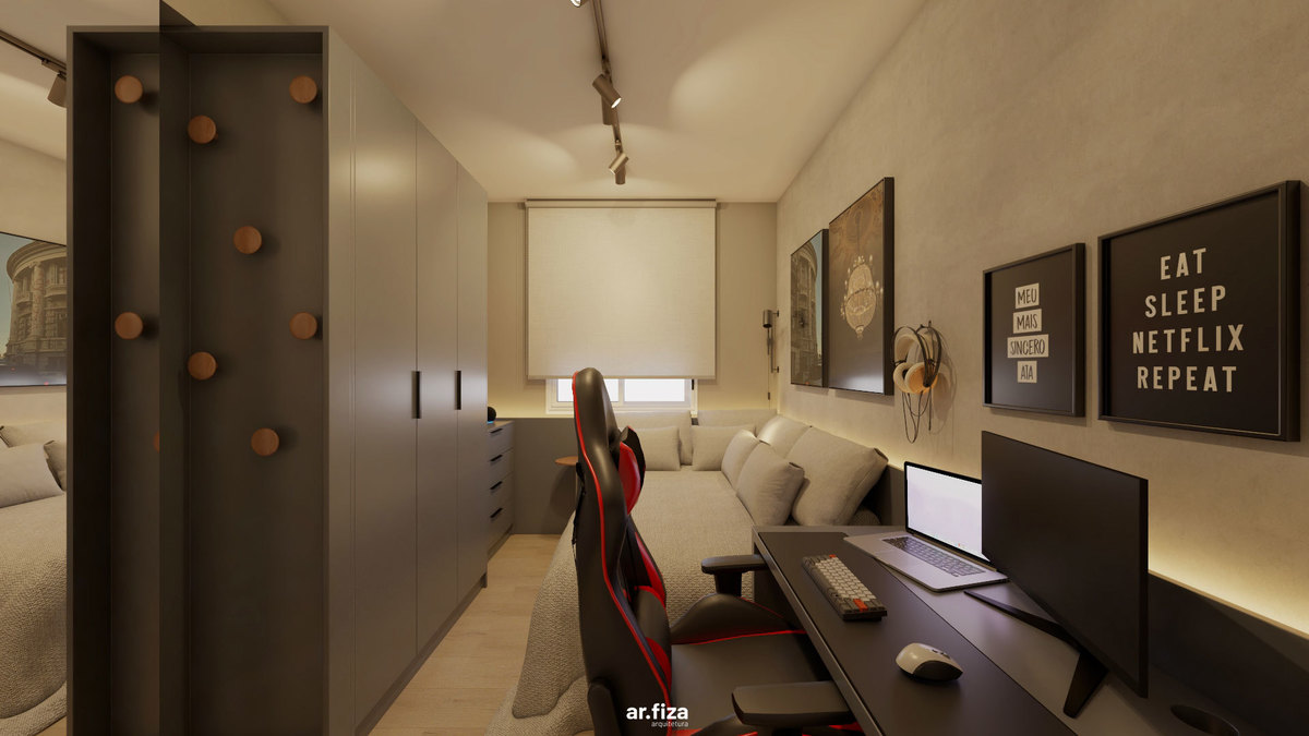 Já o quarto do filho revela outra atmosfera. Um quarto gamer com tons mais escuros, pensado como espaço de imersão e identidade. É ali que ele relaxa quando está de folga da faculdade, joga, se desconecta e vive seu tempo. As paredes recebem quadros com fotografias autorais feitas por ele mesmo — transformando o ambiente em uma extensão da sua personalidade. Mais do que um espaço de lazer, é um território de expressão.