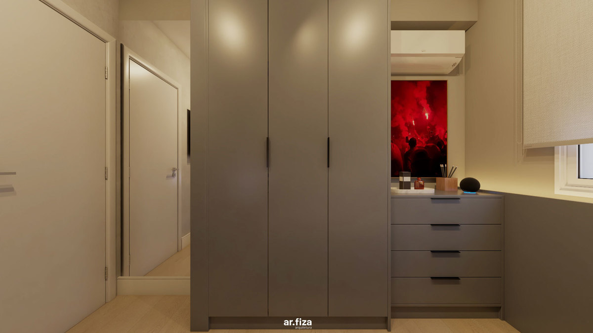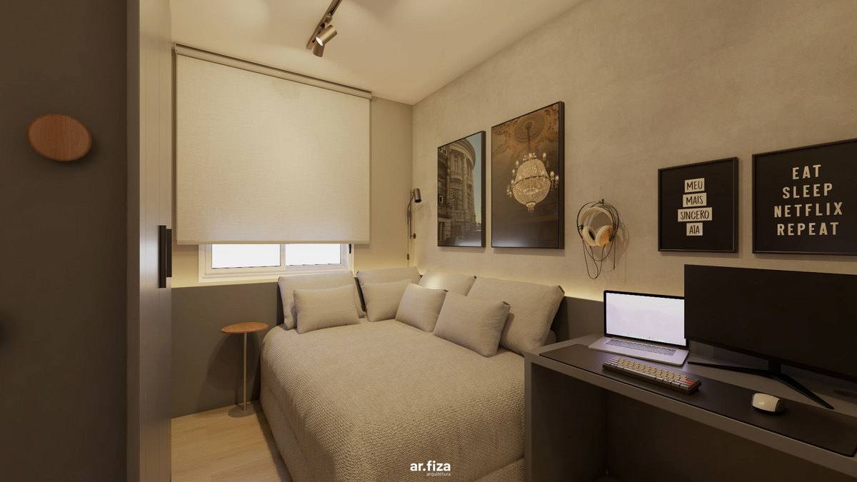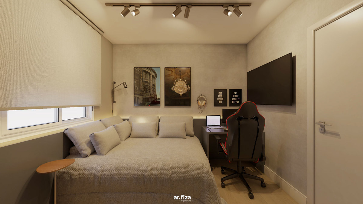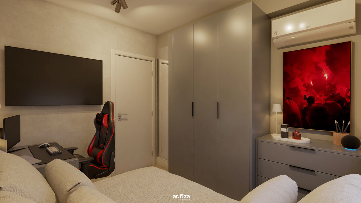 Já o quarto do filho revela outra atmosfera. Um quarto gamer com tons mais escuros, pensado como espaço de imersão e identidade. É ali que ele relaxa quando está de folga da faculdade, joga, se desconecta e vive seu tempo. As paredes recebem quadros com fotografias autorais feitas por ele mesmo — transformando o ambiente em uma extensão da sua personalidade. Mais do que um espaço de lazer, é um território de expressão.