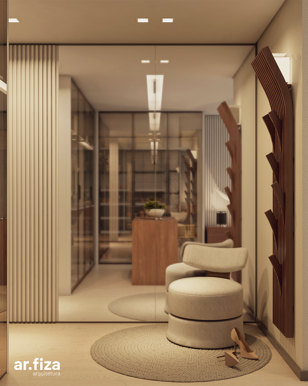 No projeto do closet do Lar. GP, a composição de peças ficou perfeita. Os itens que usamos foram: a poltrona Los Angeles do designer Luan Del Savio, que é comercializada pela Breton; o tapete redondo é artesanal produzido em maxi-crochet que é um crochê gigante; o cabideiro é uma peça de design assinado pela Lattoog, que é um mancebo-luminária composto por sequências de ripas de madeira, leva o nome de Brise e faz parte da linha de complementos da Florense. O hall de entrada da suíte do casal ficou funcional e muito aconchegante.