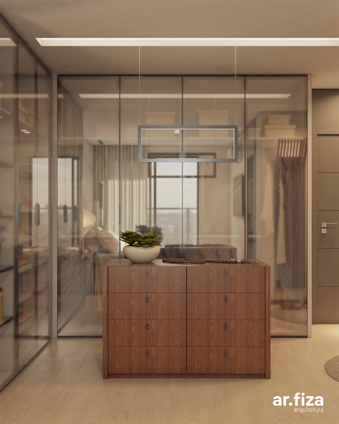 3. criamos um gaveteiro central (tipo ilha) para armazenar as roupas íntimas, meias, acessórios e peças que podem ser guardadas dobradas. E assim já ganhamos uma área de apoio, seja para as roupas que serão usadas ou para soltar as peças que irão para seu lugar dentro do roupeiro.
