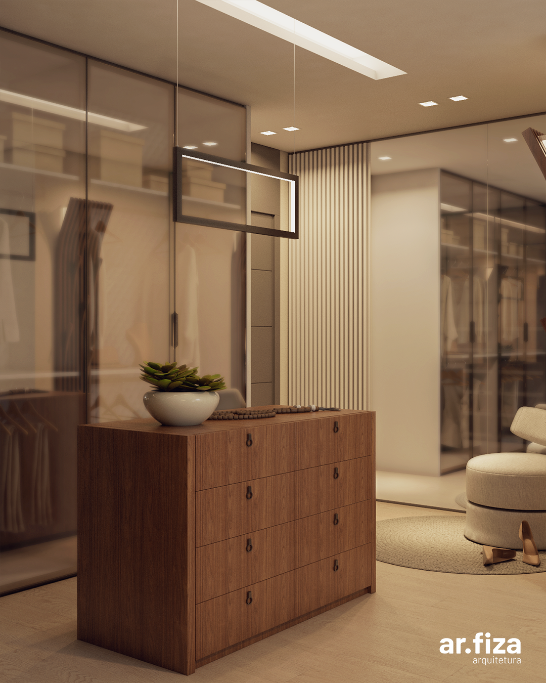4. Um espelho de corpo inteiro é mais que indispensável, de preferência que seja possível se ver de corpo inteiro e quanto mais distância você puder estar dele melhor será a visualização. No projeto, colocamos ele na maior parede, onde fizemos um painel de marcenaria com detalhes ripados e acrescentamos o espelho na maior parte, deixando ele posicionado atrás da poltrona proporcionando se enxergar de corpo inteiro e possibilitando que duas pessoas usem o espelho ao mesmo tempo. (Observar imagem abaixo)