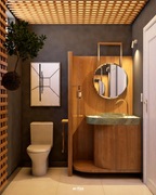 No projeto do closet do Lar. GP, a composição de peças ficou perfeita. Os itens que usamos foram: a poltrona Los Angeles do designer Luan Del Savio, que é comercializada pela Breton; o tapete redondo é artesanal produzido em maxi-crochet que é um crochê gigante; o cabideiro é uma peça de design assinado pela Lattoog, que é um mancebo-luminária composto por sequências de ripas de madeira, leva o nome de Brise e faz parte da linha de complementos da Florense. O hall de entrada da suíte do casal ficou funcional e muito aconchegante.